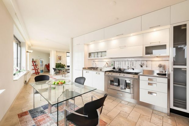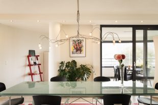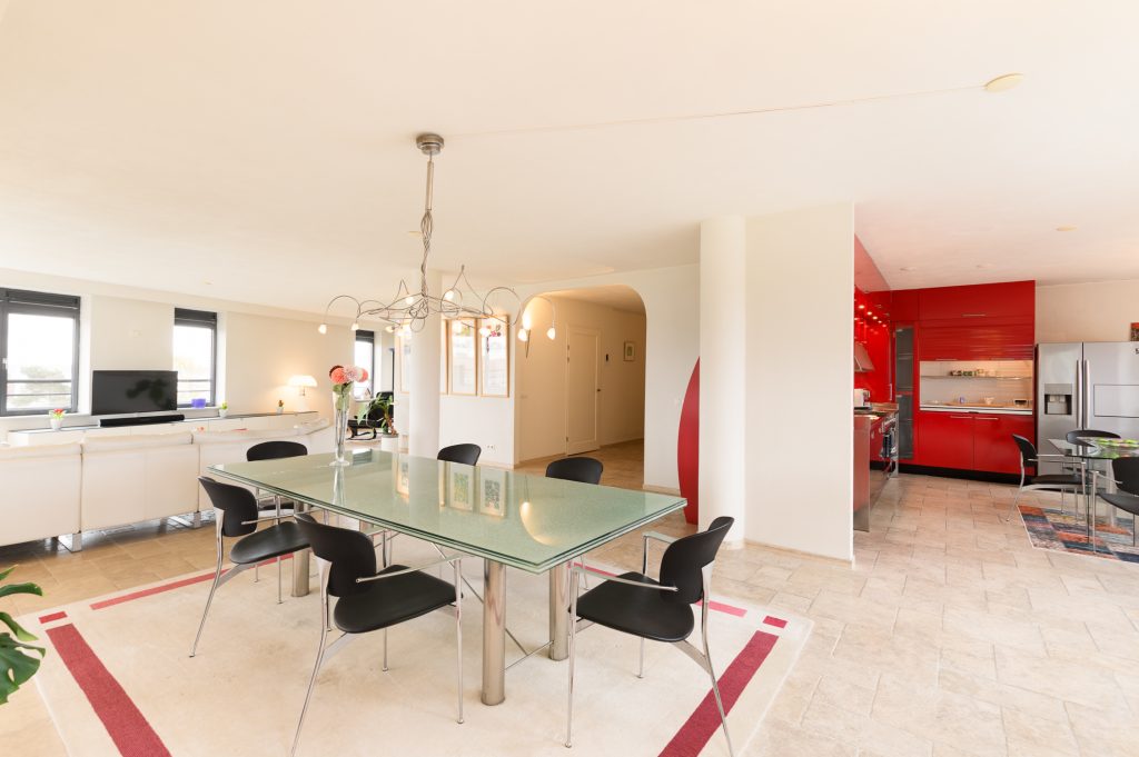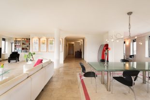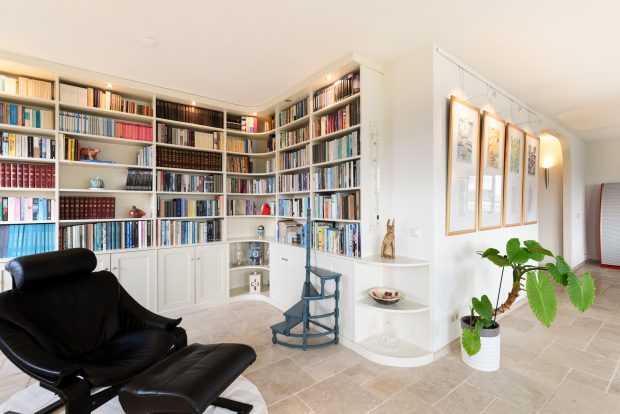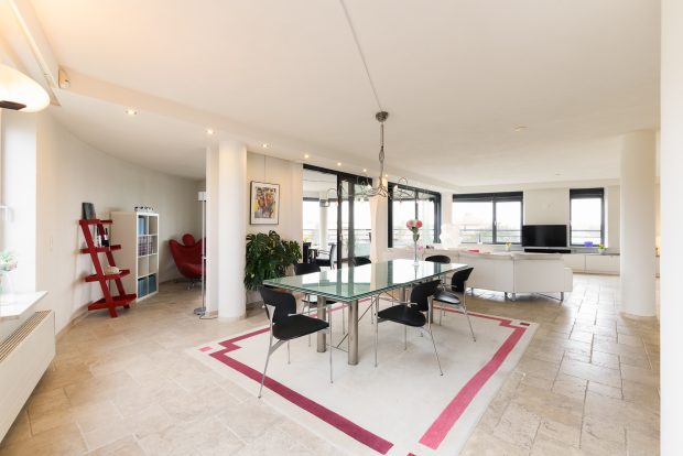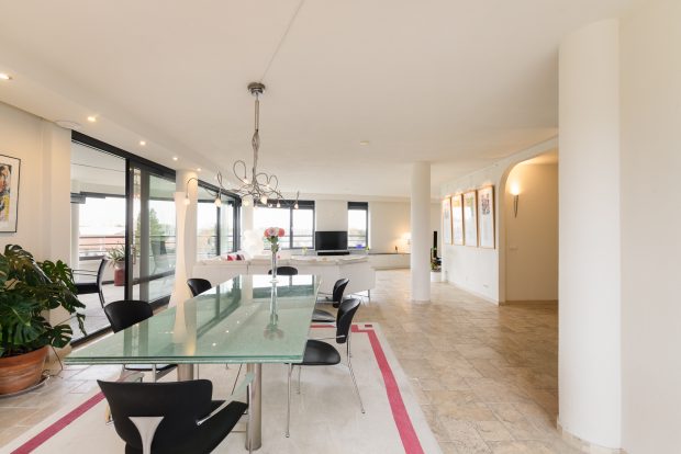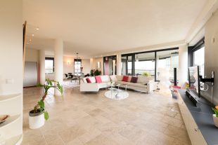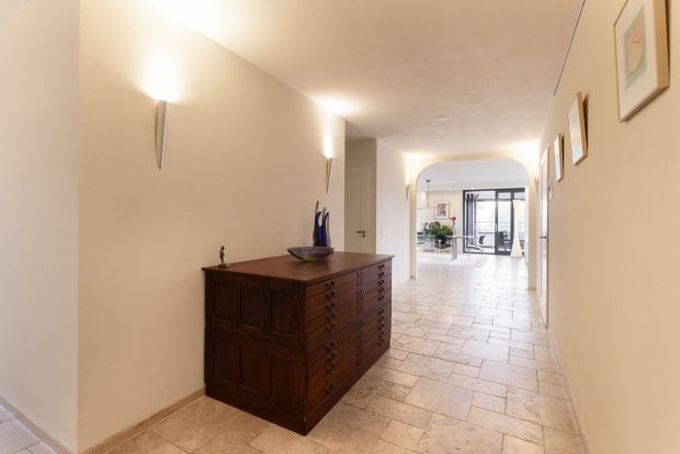 The apartment is accessed via the luxurious central hall. The spacious entrance hall is open to the bright living room of approximately 100 m². The layout is surprising and versatile, with space for a library or work corner, a second sitting area and a spacious dining room adjacent to the semi-open kitchen. The entire house is completely barrier-free.