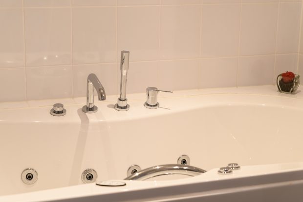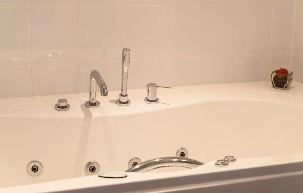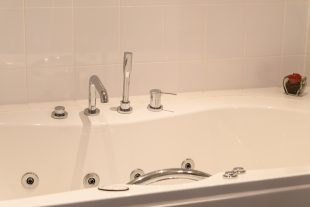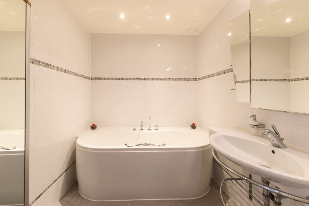 The sleeping area is accessible from the hall. The spacious master bedroom with fitted wardrobes has an en-suite bathroom with a bathtub that also has a jacuzzi function. The second bedroom/guest room has access to a second bathroom with a shower. There is also a spacious laundry room and a separate guest toilet.