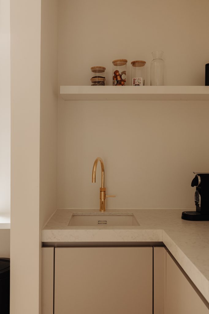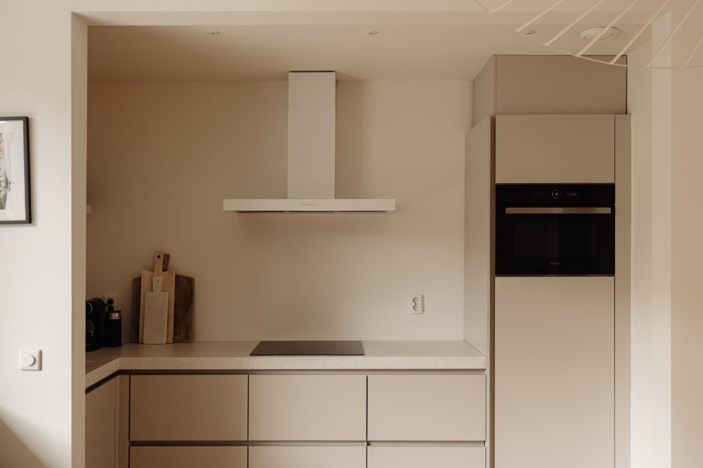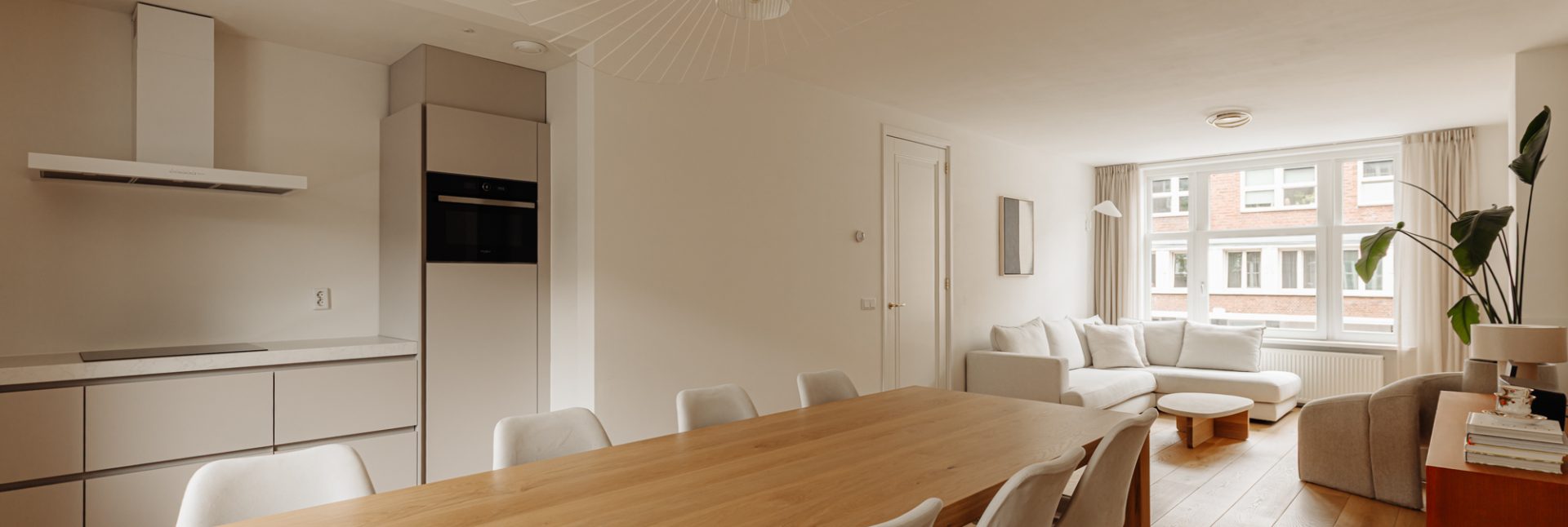 The wide and spacious living room is remarkably bright and sunny, thanks to large windows and its favorable orientation, allowing natural light throughout the day. Adjacent is the modern kitchen (2021), equipped with high-quality built-in appliances, including an induction cooktop, Quooker, dishwasher, combi oven, fridge, and freezer.