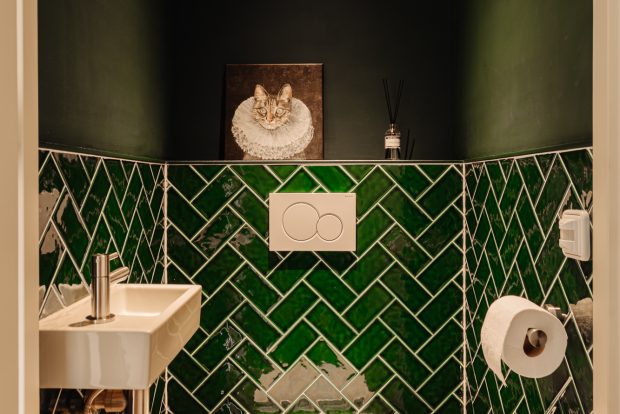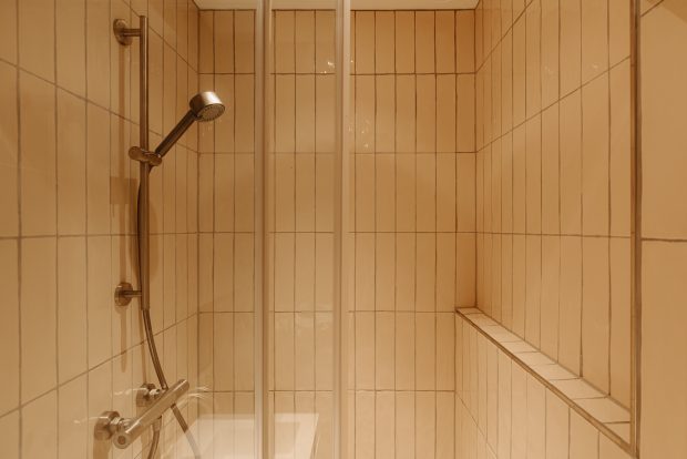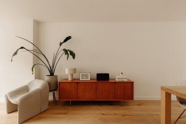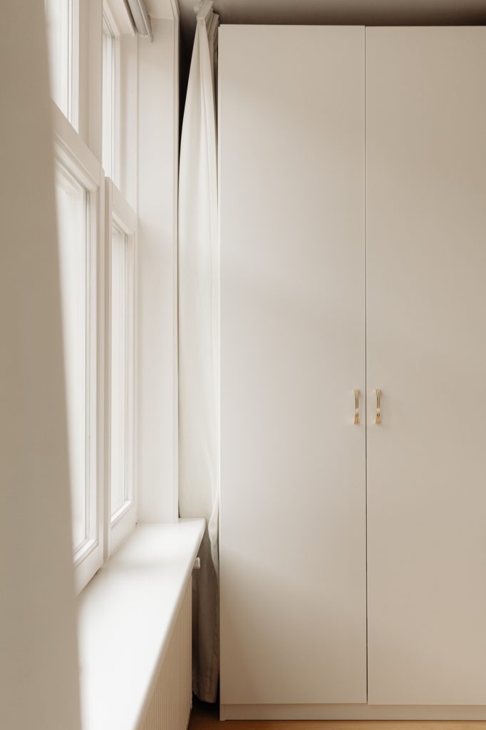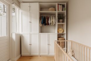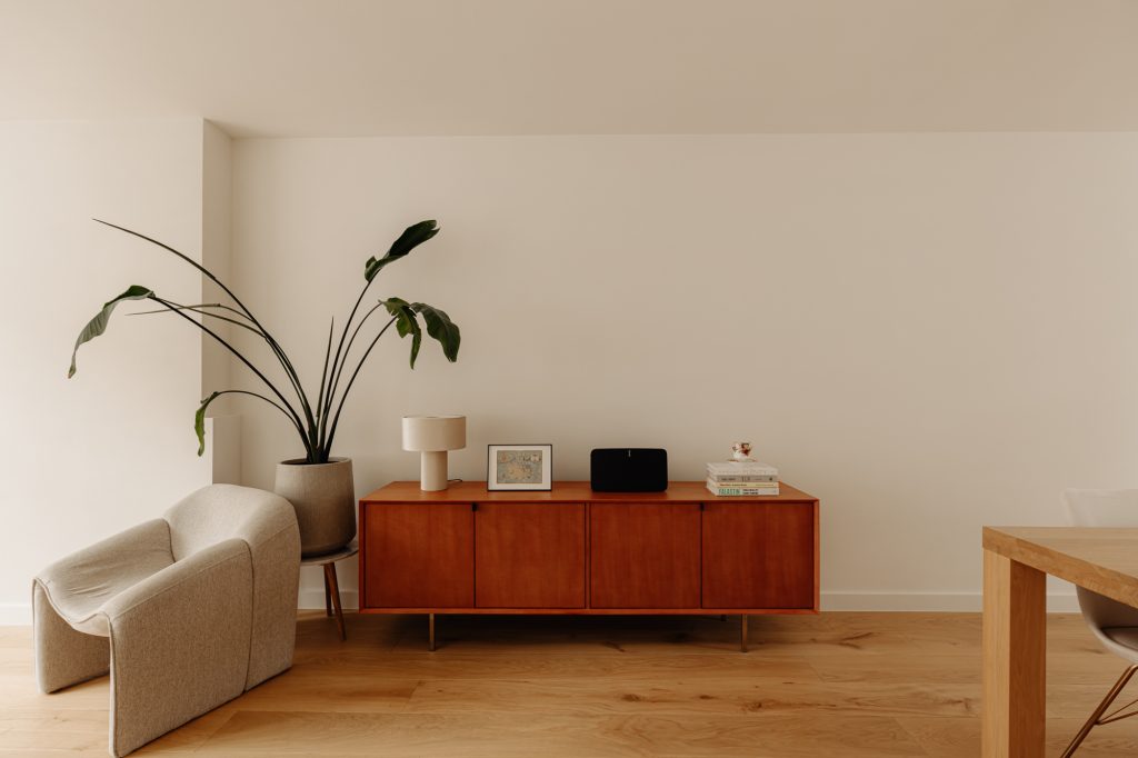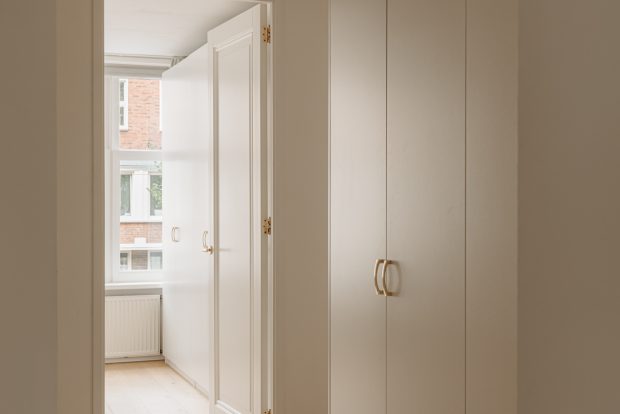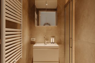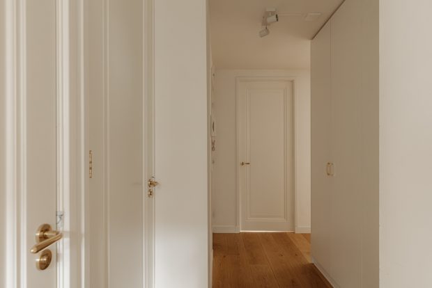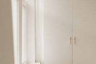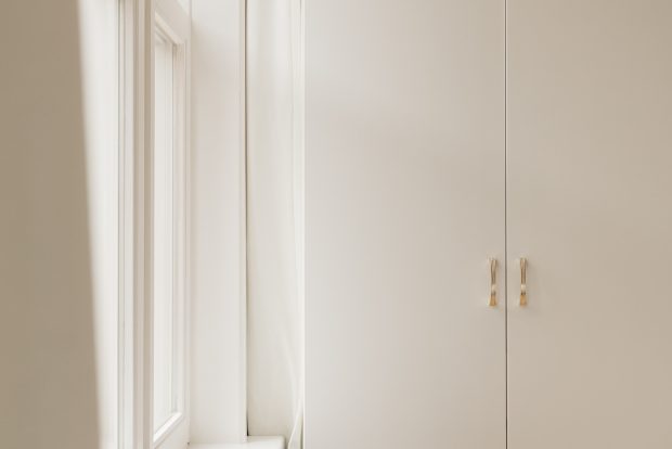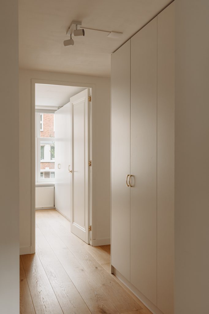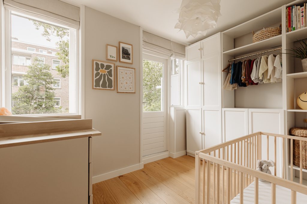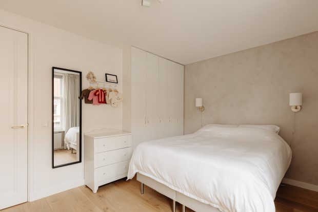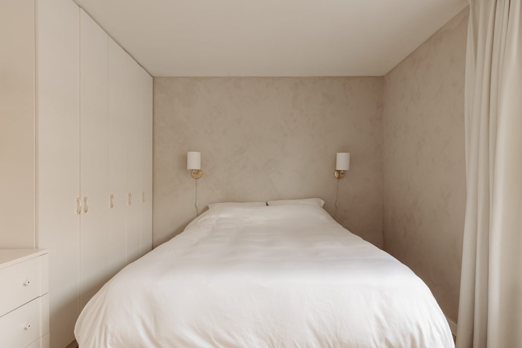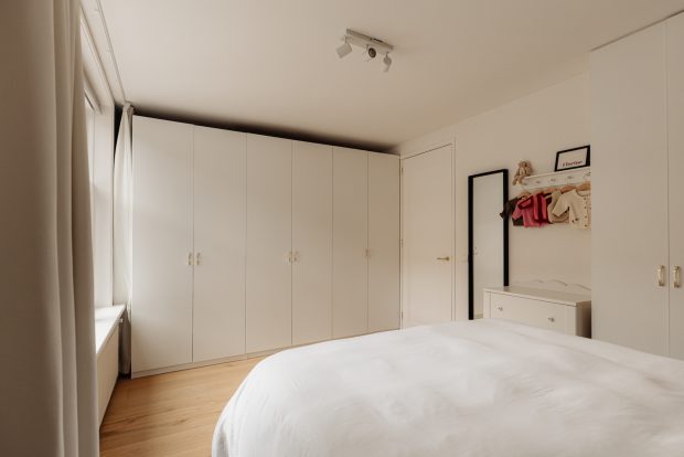 At the front of the apartment is the spacious master bedroom, featuring custom built-in wardrobes that blend seamlessly into the interior. At the rear is the second bedroom, currently used as a child’s room, but also ideal as a home office or guest room.