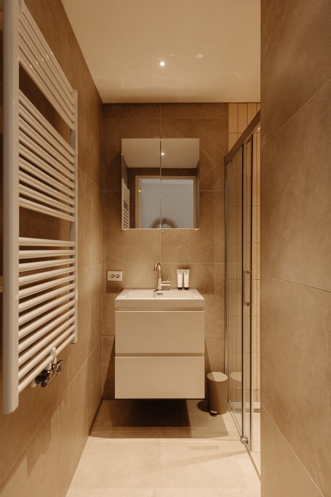 The recently renovated bathroom exudes luxury and comfort, with a stylish vanity unit, spacious walk-in shower, and high-end finishes. Next to the bathroom is a separate, generously sized toilet.
