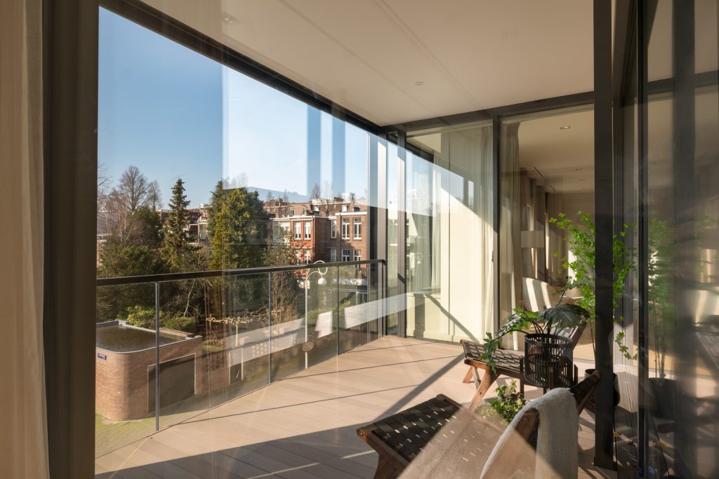 The apartment has two spacious loggias facing southwest, which are sunny in the afternoon and are the perfect place for a good book or a cup of coffee. The sheltered space ensures that you can sit comfortably here in any season, protected from wind and rain, but with most sun hours of the day thanks to the southwest orientation. The open view over the J.J. Viottastraat provides a relaxing ambiance. The impressive glass facade not only offers a beautiful panorama, but also a seamless transition between inside and outside, so you can also enjoy the outdoor feeling indoors.