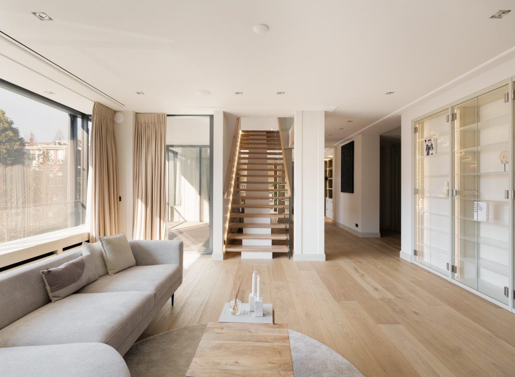 This one-of-a-kind apartment with a metropolitan architecture and high-end finishes is located in an intimate boutique building with an elegant and refined character, designed in 2016 by the renowned architects of Van Dam and Partners – a refreshing, minimalist and modern addition to the beloved historic street landscape of Amsterdam South. The apartment, which originally consisted of two separate residential units, is now a spacious duplex apartment of approx. 500 sqm spread over two floors of 250 sqm each. Both floors offer panoramic views with a front width of a soaring 27 meter while the two spacious loggia’s ensure a seamless transition to the outdoor environment. This creates a special metropolitan atmosphere, comparable to New York apartments on Central Park, and create a unique synergy of space, design and light, which is unique in Amsterdam.
