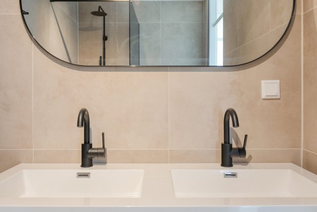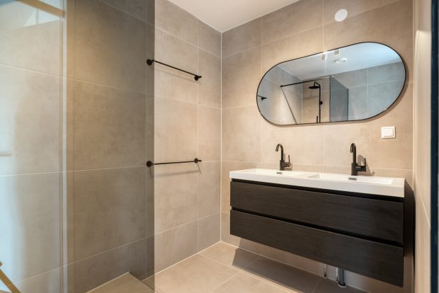 The apartment features two well-sized bedrooms, a stylish bathroom with walk-in shower and double sink, a separate toilet, and a practical utility room with connections for a washing machine and dryer. The property has been renovated down to the last detail and is ready to move in.