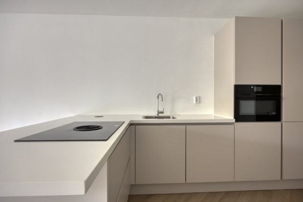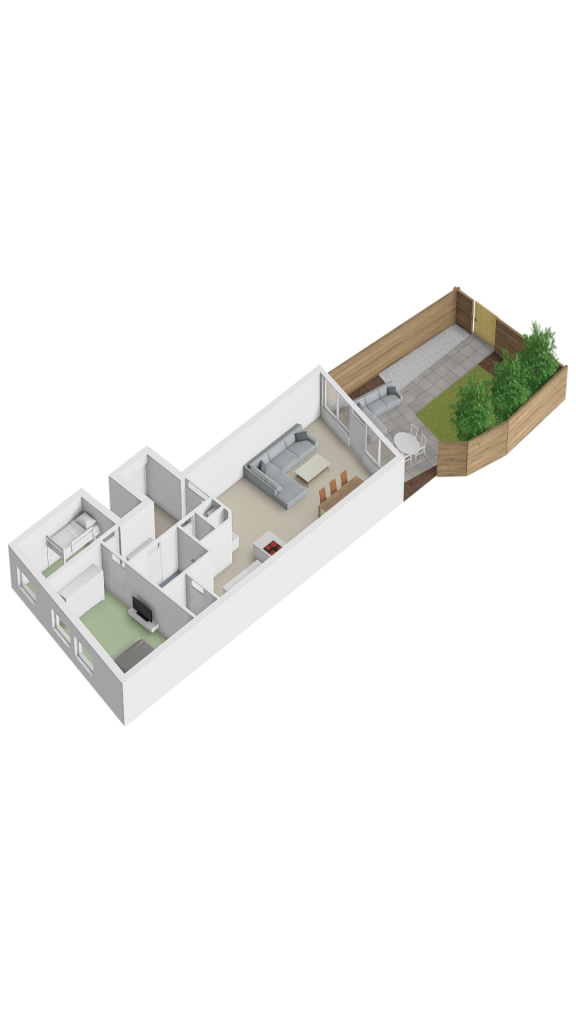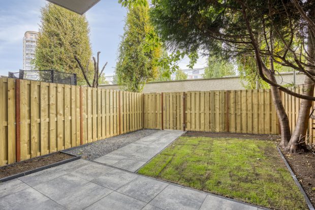 The central entrance leads to the apartment on the ground floor. A spacious hallway opens into a bright living room with large windows and a semi-open kitchen. From the living room, you step directly into the private garden — a peaceful outdoor space perfect for relaxing, entertaining, or enjoying the sun in privacy.