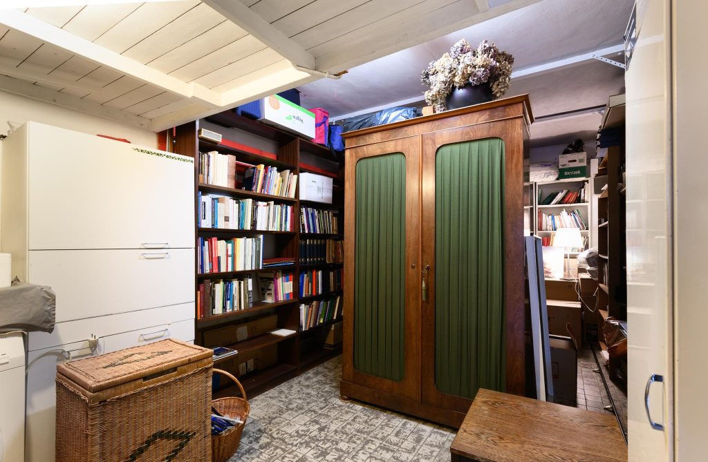 Entrance, hallway with meter cupboard and a closed second closet, a separate space with the central heating boiler, separate toilet, indoor garage with connections for washing machine and dryer. Big office space at the rear, currently used as an office. Backyard facing southwest, equipped with a private shed. The ground floor is ideal as a potential home office.