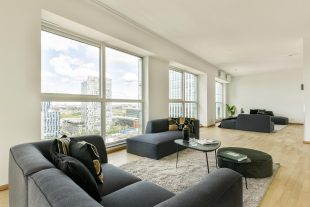 The flat is accessed via a luxurious and spacious lift. The entrance to the flat leads to a generous hallway that provides access to the living room, a separate toilet and a practical storage room. The living room offers complete freedom for interior design with three large south-facing windows that fill the room with natural light throughout the day. As the windows run vertically, the space feels extra high and airy, perfectly reflecting the urban energy of the Zuidas. The light wooden floors contribute to a fresh and spacious atmosphere. Central to the living room is the luxury kitchen, equipped with natural stone worktops, a hob, a built-in oven and ample storage space. A unique feature is the conservatory with French windows, which creates an indoor-outdoor experience-ideal for relaxing with panoramic views of the Zuidas skyline.