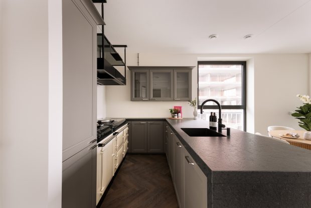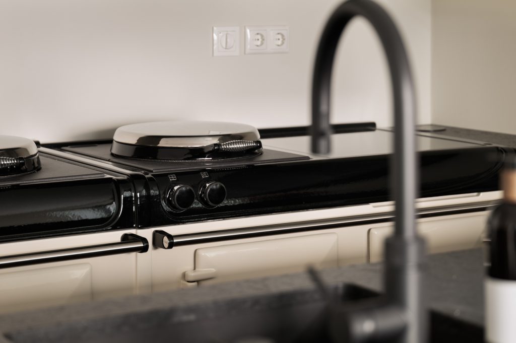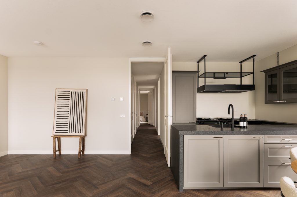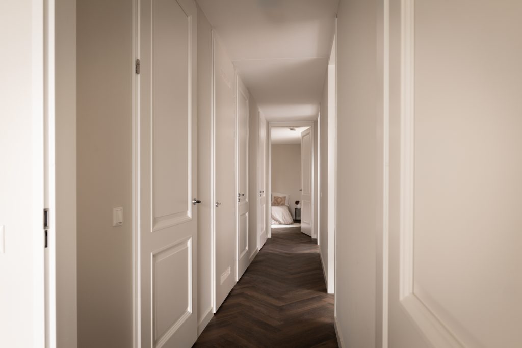 Entrance with meter cabinet. Large and bright living room with access to the terrace, located on the south west. High-quality kitchen from AGA (eR3 series) 160-5/5i, consisting of a conventional hot air oven, a warm oven, a simmering oven, a grill/roast oven, a simmering oven, a warm oven, and storage for cookware. The equipment is extremely suitable for cooking enthusiasts. In a (nearly) island setup and equipped with complete built-in equipment. Through the hallway, you can access the three good-sized bedrooms, all extremely suitable as bedrooms or home offices. The bathroom is equipped with a walk-in shower, a double sink with furniture, a mirror with built-in lighting, a towel radiator, and an eye-catching rear wall. The separate toilet is equipped with the same material with an eye-catching rear wall. Separate is the technical room with a washing machine connection. The apartment is spacious and bright due to the corner location, the high ceilings, and the large windows. The walls are already finished, and the floor is made of high-quality PVC. Additionally, there is a private storage room in the basement.