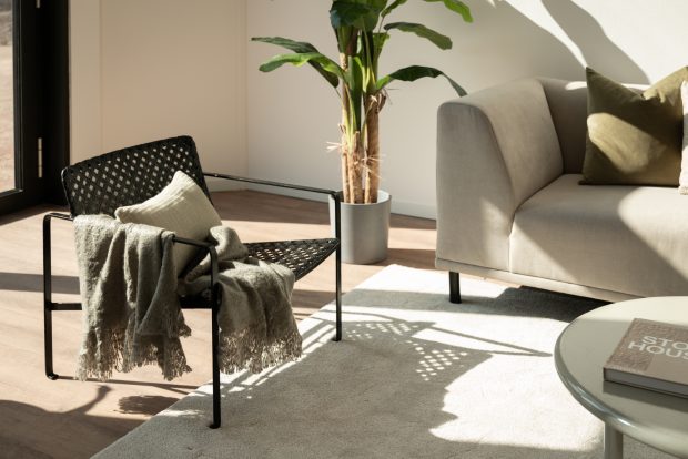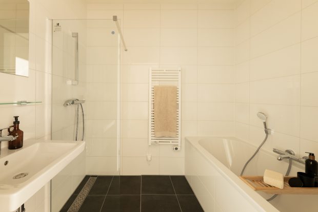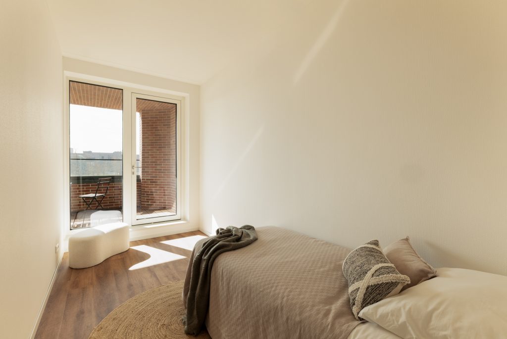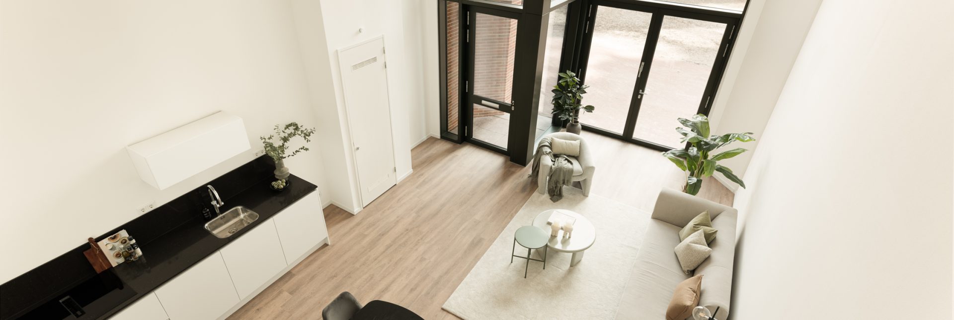 These elegant and stylish apartments welcome you with an entrance on the ground floor, where the living area and open kitchen are also located. The extra-high ceiling enhances the sense of space and freedom, contributing to a luxurious living experience. On this level, you will also find a separate toilet, spacious storage room and access to the outdoor area. A playful mezzanine overlooks the living space and offers versatile possibilities, perfect for a home office or a cozy lounge corner.