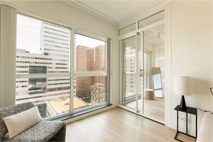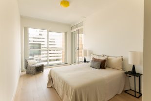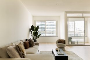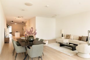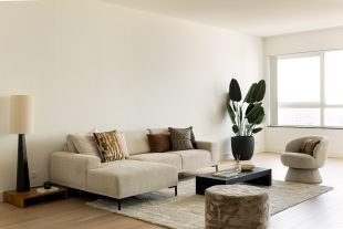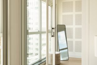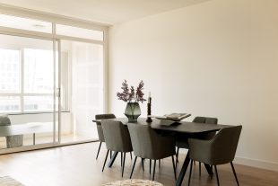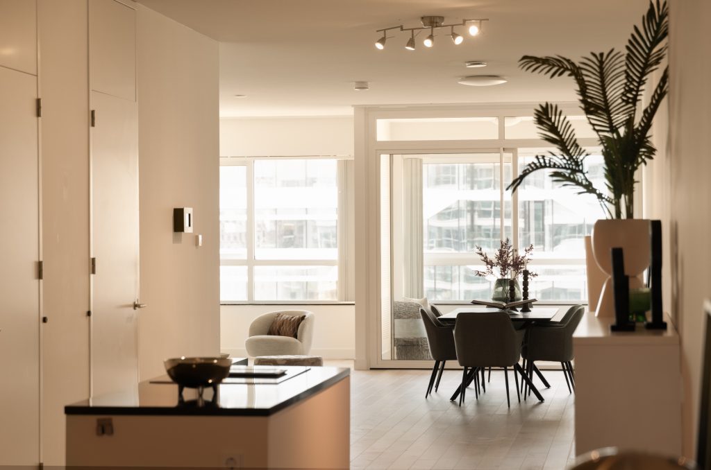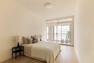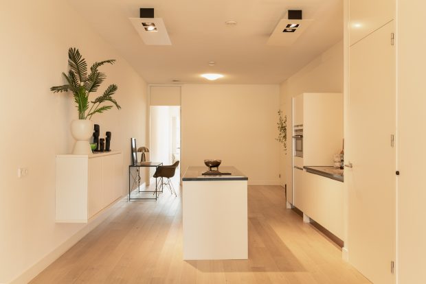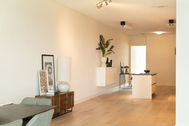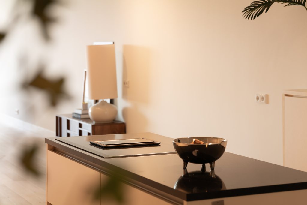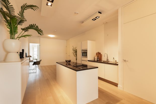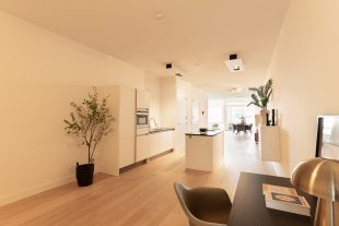 The lift takes you to the apartment on the fourteenth floor. The spacious hallway gives access to all rooms. The generous living room is filled with natural light thanks to the large windows and offers ample space for both a comfortable lounge area and a dining table. The modern open kitchen features luxury built-in appliances, a natural stone worktop, and plenty of storage space.