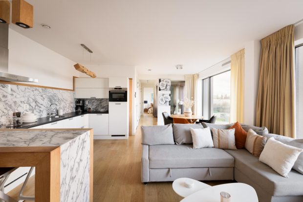 The living room is a bright space from which you can overlook the entire apartment. You also have a constantly changing view of the harbors from here. Thanks to the large windows, from floor to ceiling, the apartment is filled with natural light, and because of its northwest facing location, you will have sun in the evening and a view of the most beautiful sunsets. Putting a comfortable couch or chair in your living room to enjoy all the beauty that can be seen outside is therefore an absolute must.