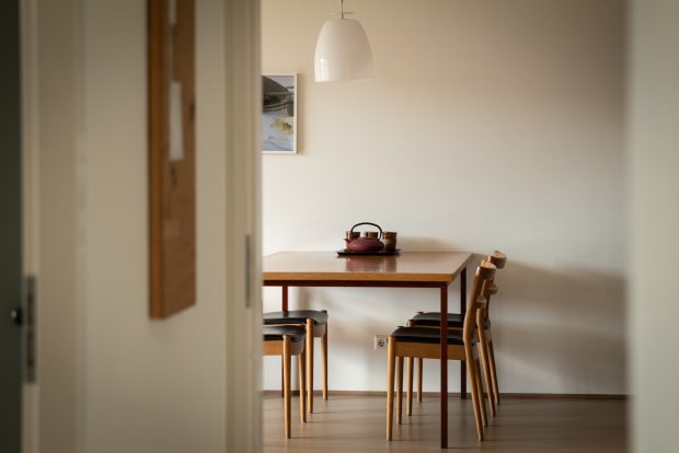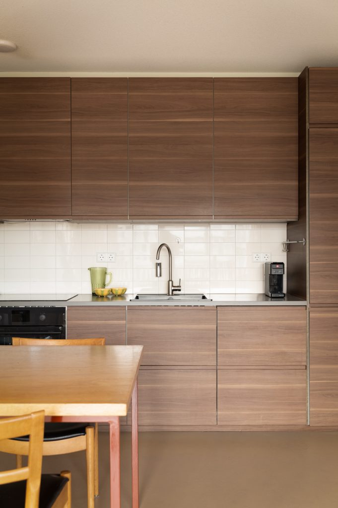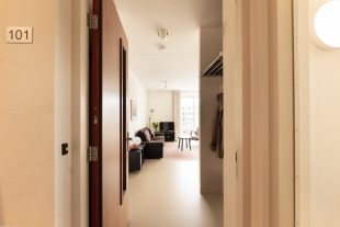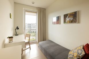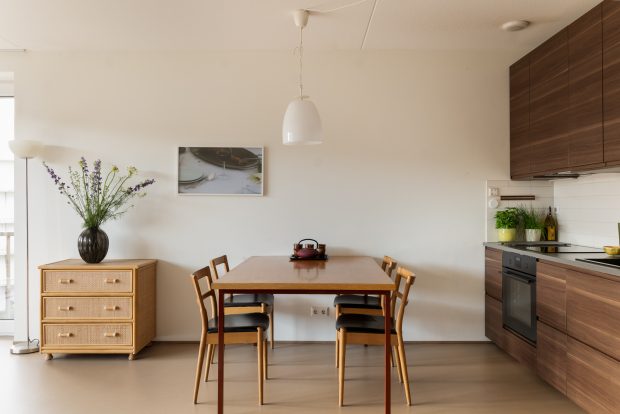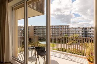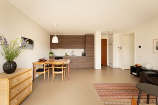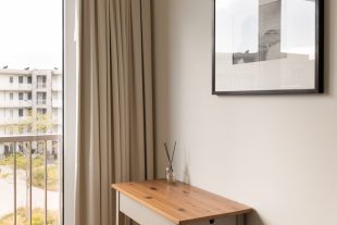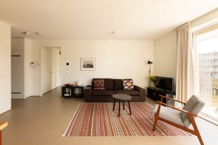 The living room forms the heart of the apartment, with large windows that provide an abundance of daylight and direct access to the generous south-facing balcony. Here you can enjoy sunny afternoons and long summer evenings, overlooking the beautiful courtyard. The open kitchen seamlessly connects to the living area and offers all the comfort for those who love to cook and entertain.