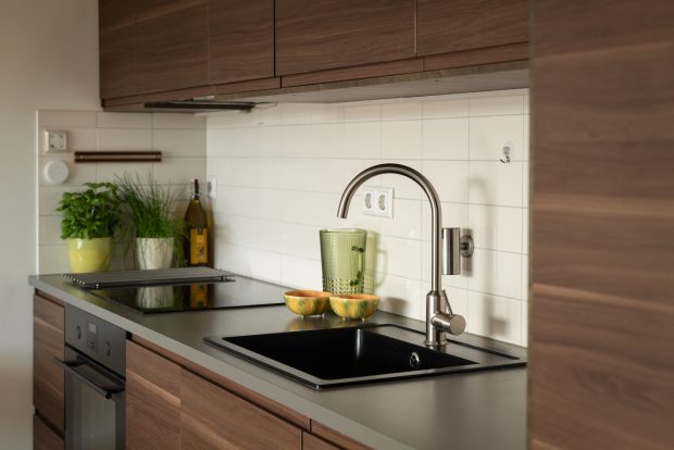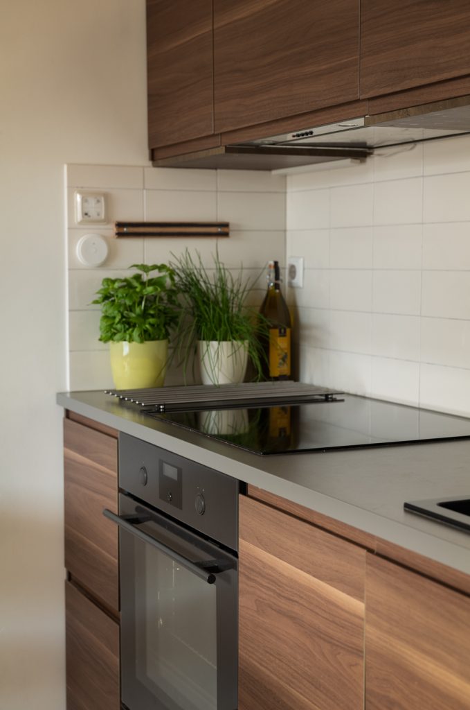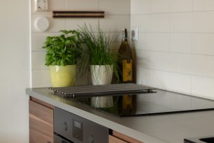 The apartment is finished with a sleek linoleum floor that is not only low-maintenance but also features underfloor heating and cooling — a pleasant base for every season. The open kitchen is equipped with an induction hob, oven, fridge-freezer combination, and dishwasher (all from 2018). There is a separate toilet, and in the adjacent technical room you’ll find connections for a washer-dryer combo, mechanical ventilation, the district heating unit, a boiler, and ample storage space.