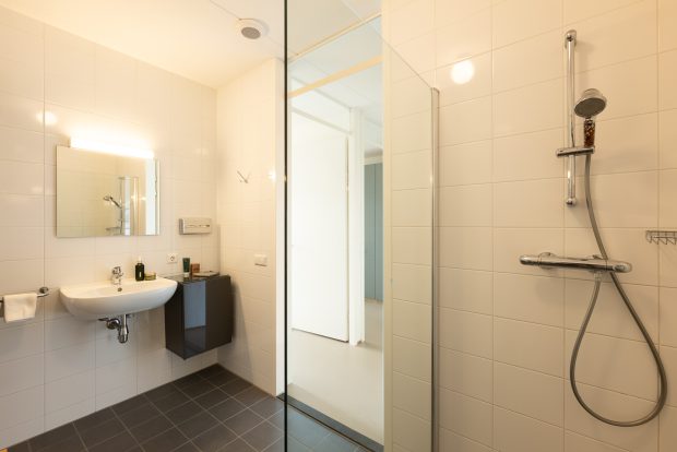 The bathroom is modern and practically designed with a walk-in shower, sink, and a towel radiator for extra comfort.