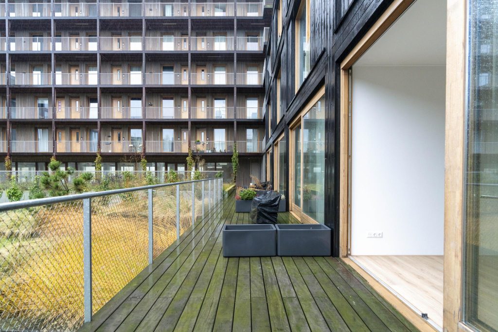 Welcome to this spacious and bright single-family home! Upon entering, you will discover an open-plan living kitchen with access to the living deck (terrace/balcony) that overlooks the communal courtyard garden. This property benefits from an abundance of natural light due to the large floor-to-ceiling windows. With a generous sliding door, the living deck is perfect for summer barbecues or cosy get-togethers with friends and family. The dining kitchen is located at the rear on the ground floor and offers enough space for a comfortable seating area and a dining table. The open kitchen is smart and equipped with built-in appliances such as an induction hob, oven/microwave, dishwasher, fridge and freezer. Right next to the kitchen there is a meter cupboard that offers extra storage space.