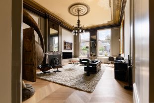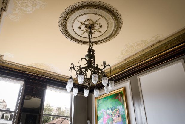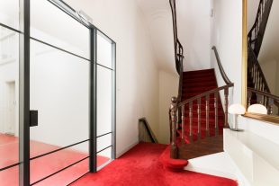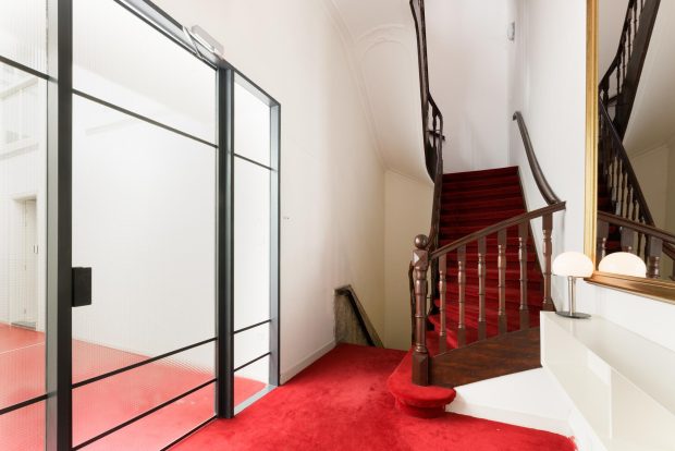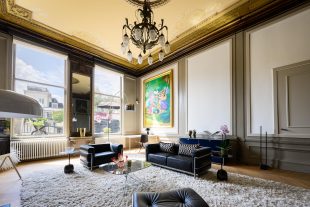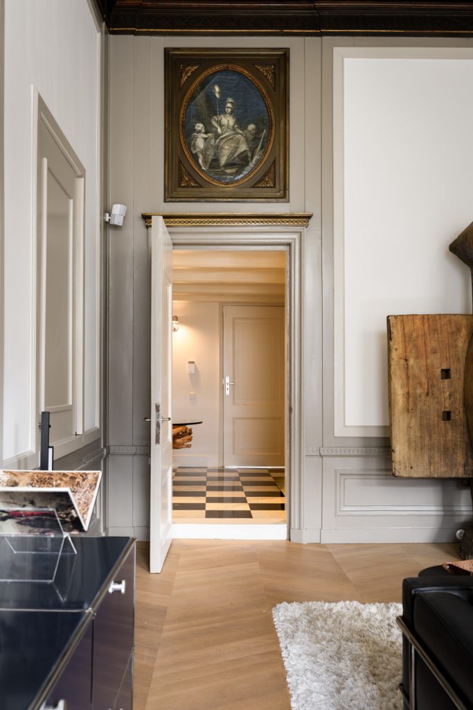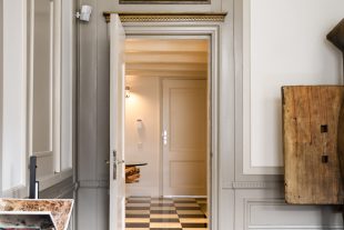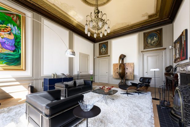 The living room is undoubtedly one of the most impressive rooms in the home. With original murals, a marble fireplace and a beautiful classic stucco ceiling, you can feel history in every corner. These French ornaments give the room a luxurious and exclusive feel, perfect for anyone with an eye for design and refined finishes. Despite its historic charm, the room has been completely renovated and equipped with modern conveniences, so you will feel right at home. The high ceiling of over 4 meters, large windows and many authentic elements give the room a bright and open atmosphere.