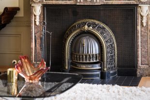 – Characteristic living room with marble fireplace and wall paintings;