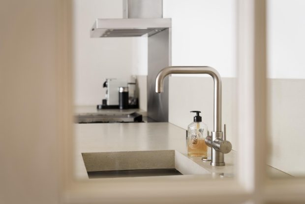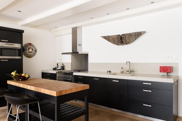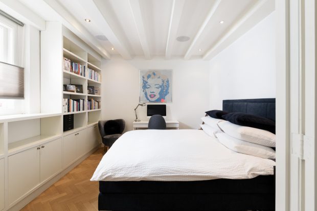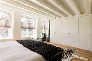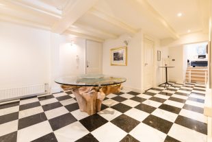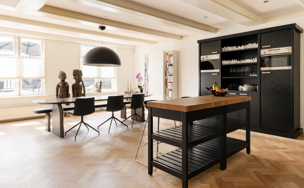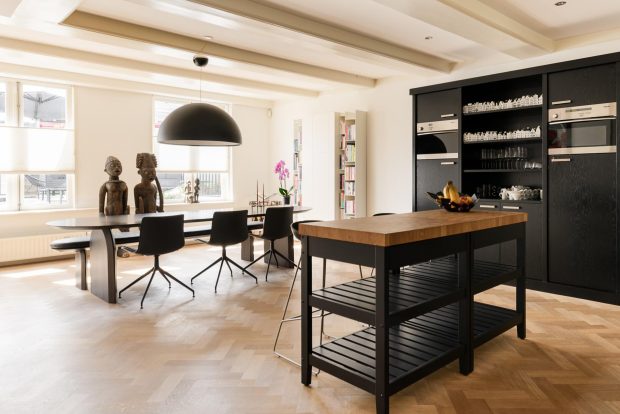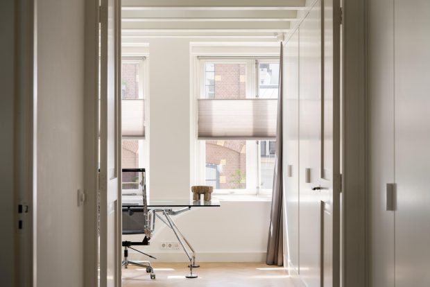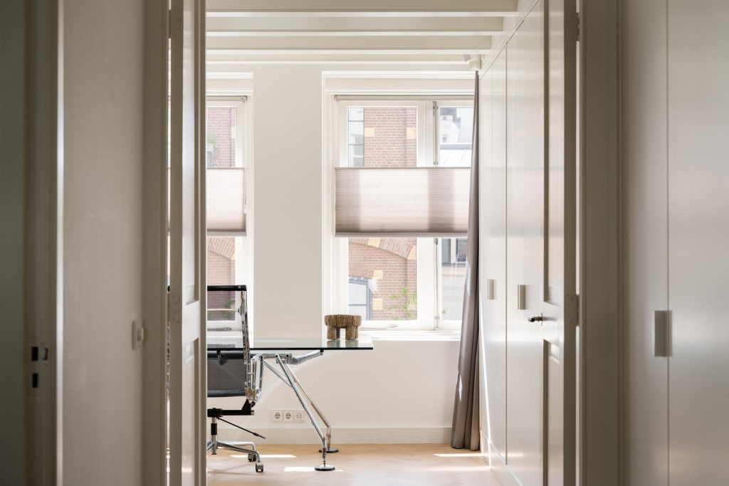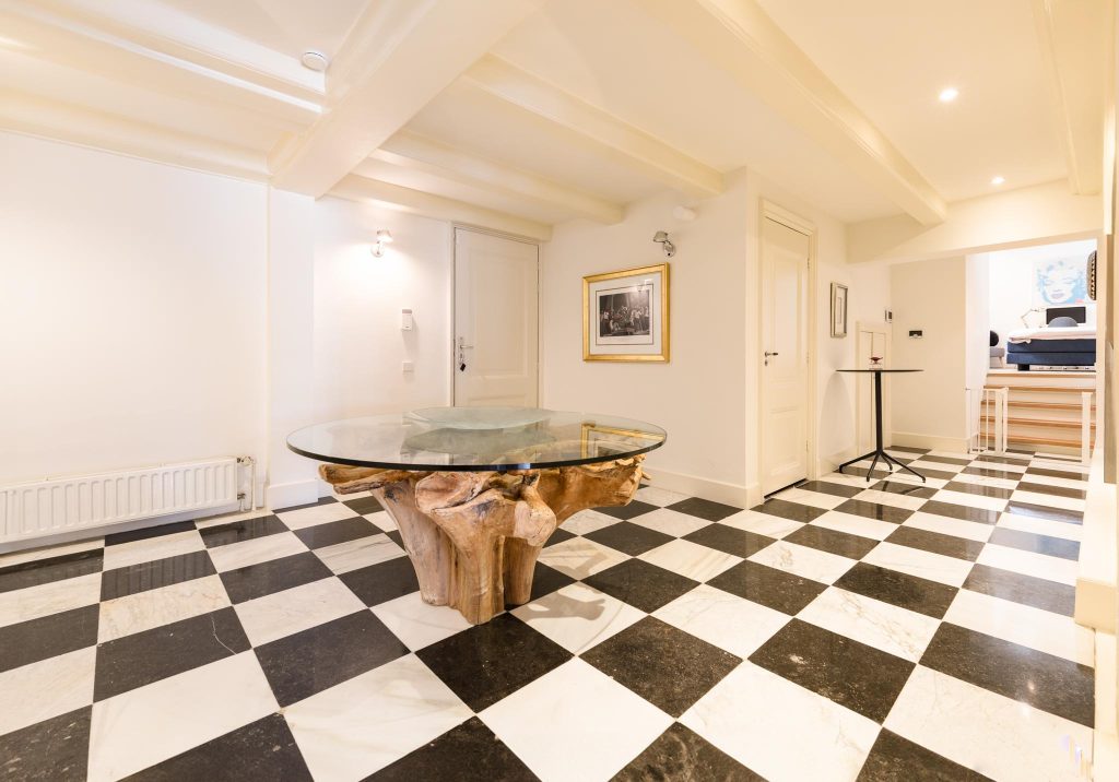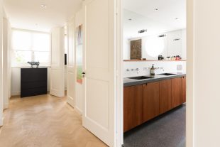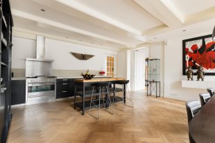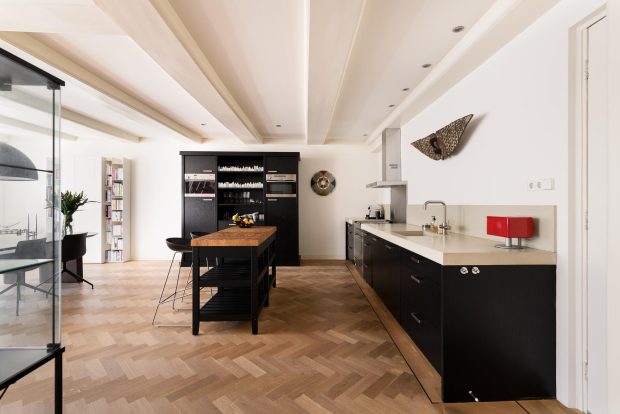 The central hall on the bell floor leads you directly to the apartment, where you enter a spacious living hall with a characteristic tiled floor, typical of eighteenth-century Amsterdam buildings. From this hall you have a view of the living kitchen, the heart of the apartment. The spacious kitchen, with an elegant herringbone floor, is equipped with modern appliances and finished with refined materials, including a stylish granite countertop. The breakfast bar and spacious layout make this the place to gather, perfect for long evenings of dining with friends or family. Large windows let in plenty of natural light and offer beautiful views of the green roof garden.
