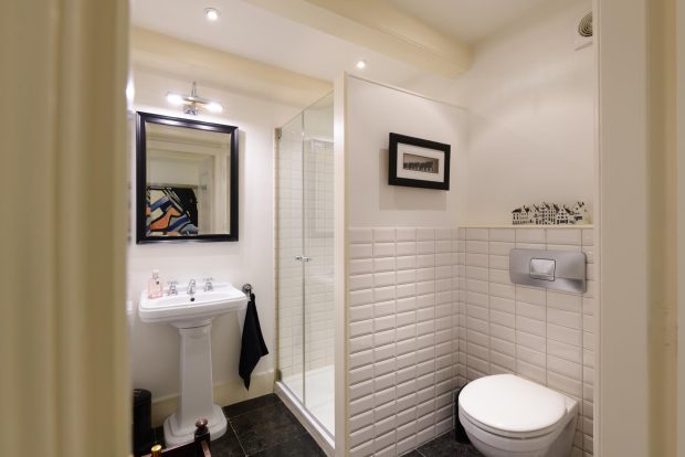 In the hall you will find a guest toilet with shower, as well as a separate room for the washing machine and extra storage. A few steps up you reach the sleeping quarters, both rooms with a generous and historic feel thanks to the exposed child beams in the ceiling, combined with a modern herringbone floor. Both bedrooms are spacious, bright and feature generous built-in closets. They are located at the quiet rear of the property, providing a serene living experience. One room overlooks the courtyard, while the other overlooks the garden. The master bedroom is perfect for relaxation, while the second bedroom is versatile as a nursery, guest room or comfortable home office. On this floor you will also find the second bathroom, stylishly finished with luxurious granite and refined details, creating a relaxing atmosphere. With a spacious bathtub, two sinks and a walk-in shower, it is the ideal place to completely unwind.