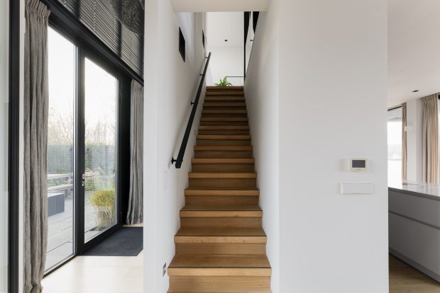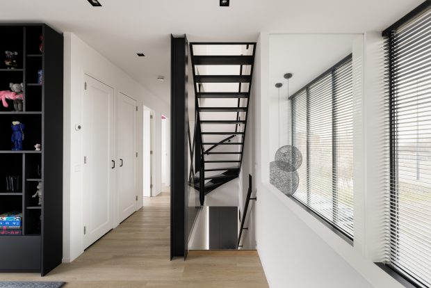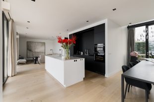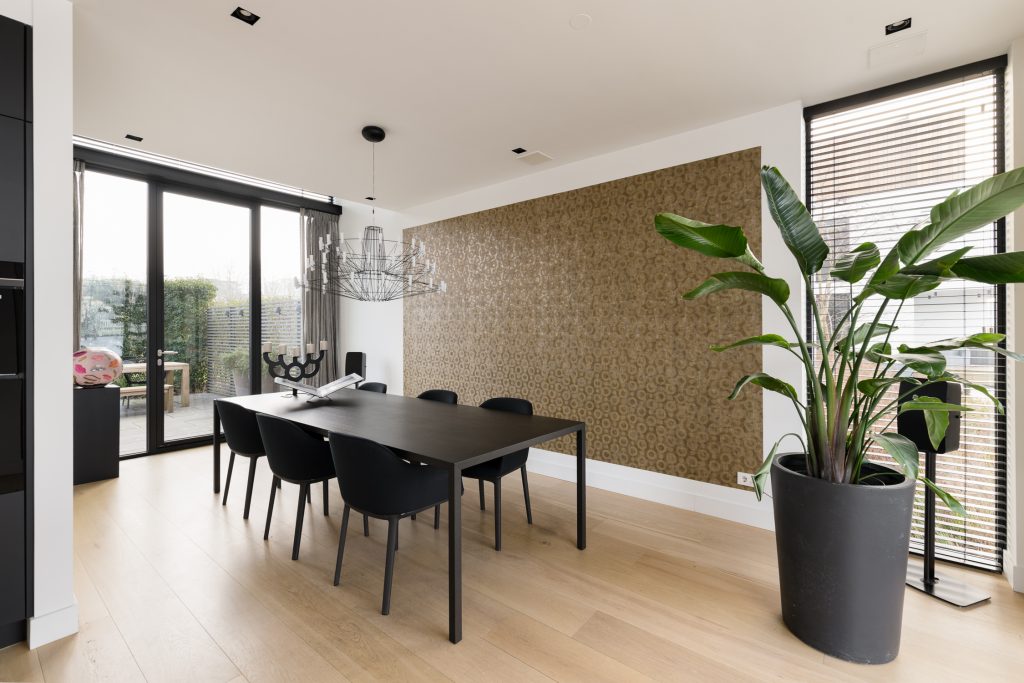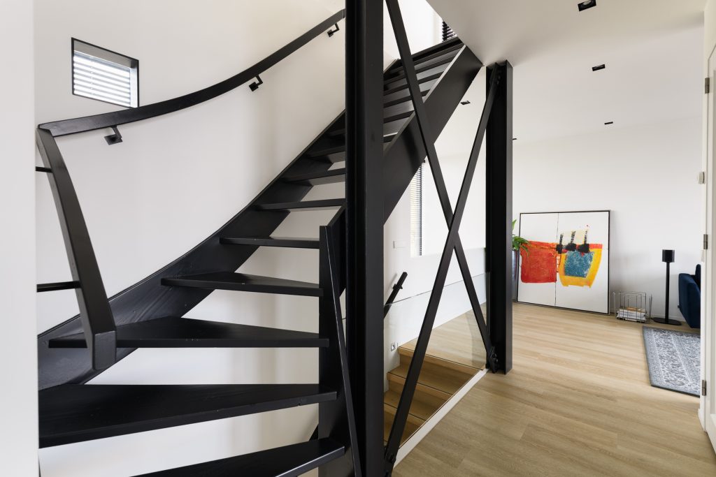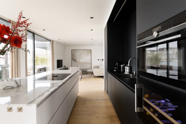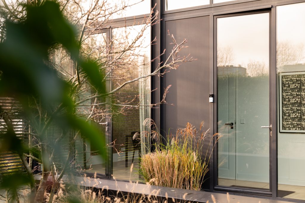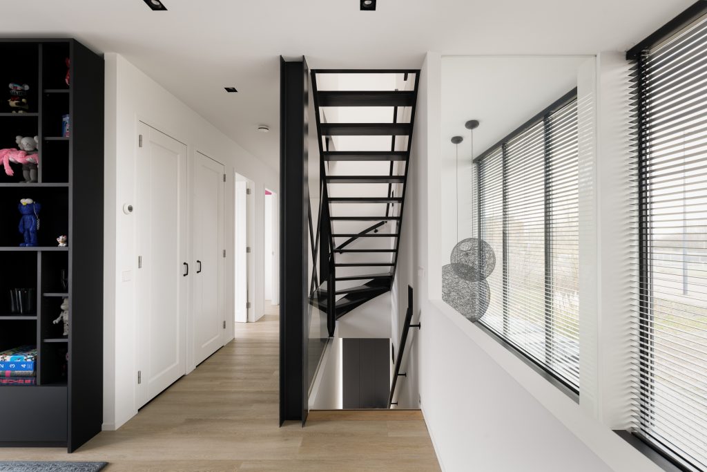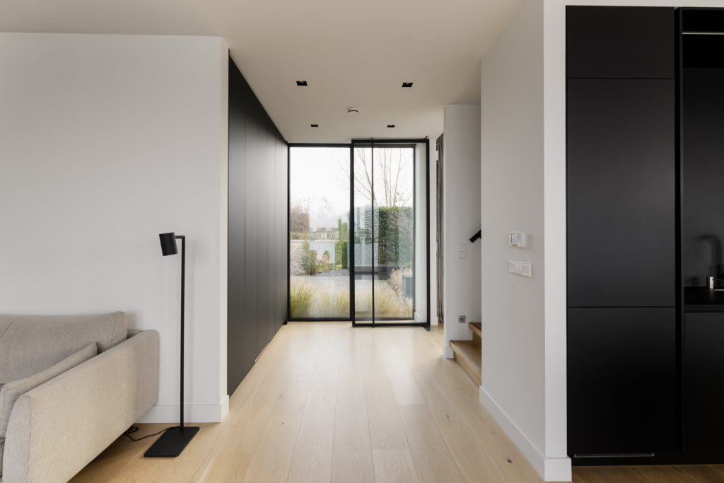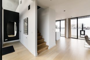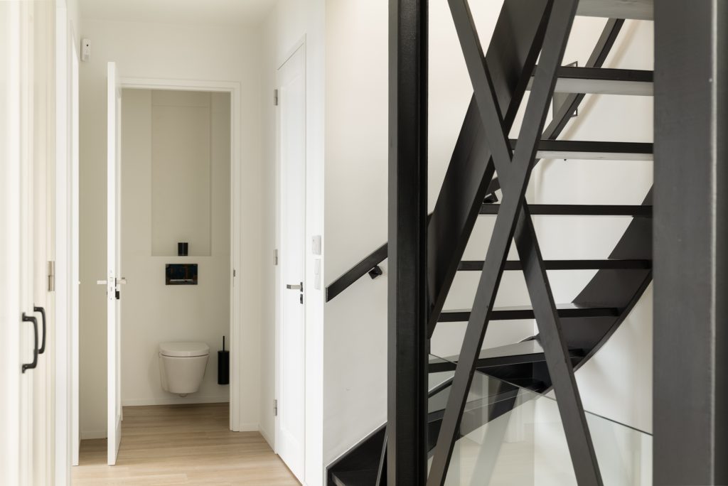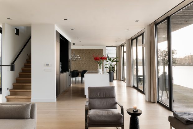 Through the beautifully landscaped front garden, you reach the entrance of the home. The ground floor is an impressive open-plan living space where the living room, dining area, and kitchen flow seamlessly together. The atrium and large windows create exceptional natural light and a sense of spaciousness. The luxurious kitchen is equipped with premium built-in appliances and forms the heart of the home, with direct access to the waterside terrace.