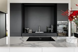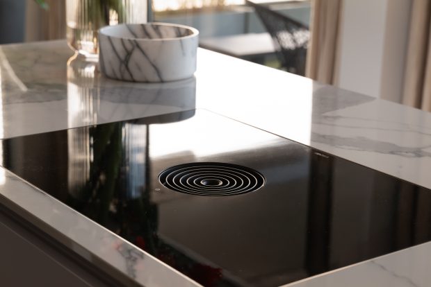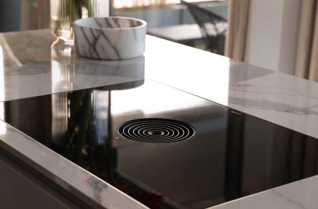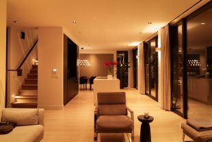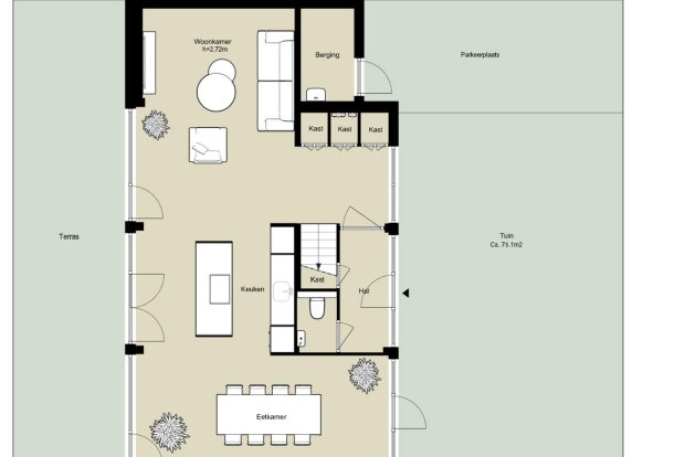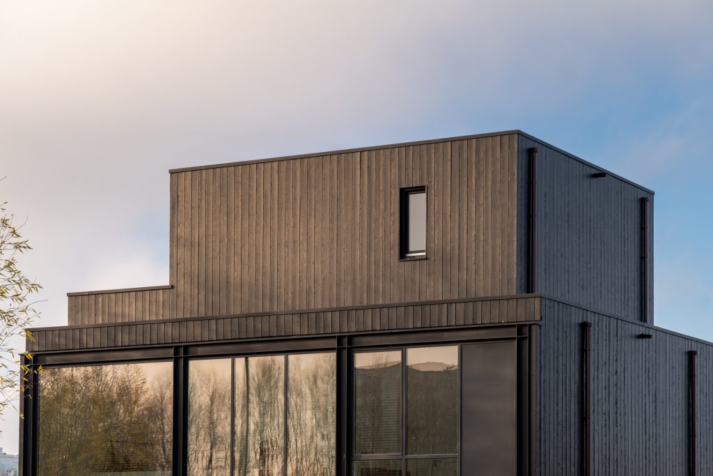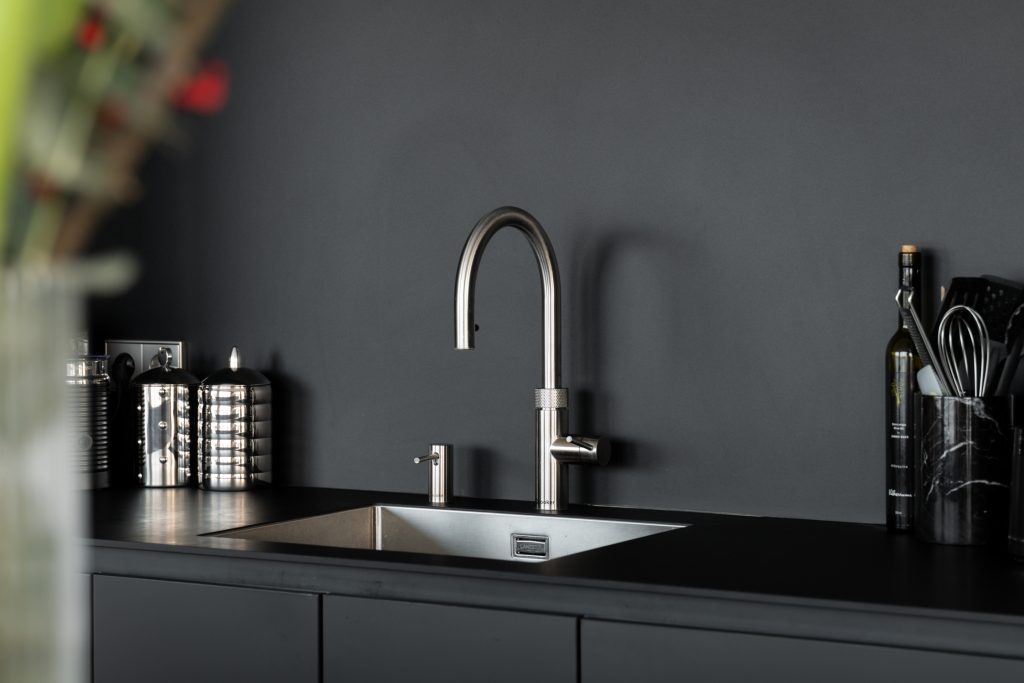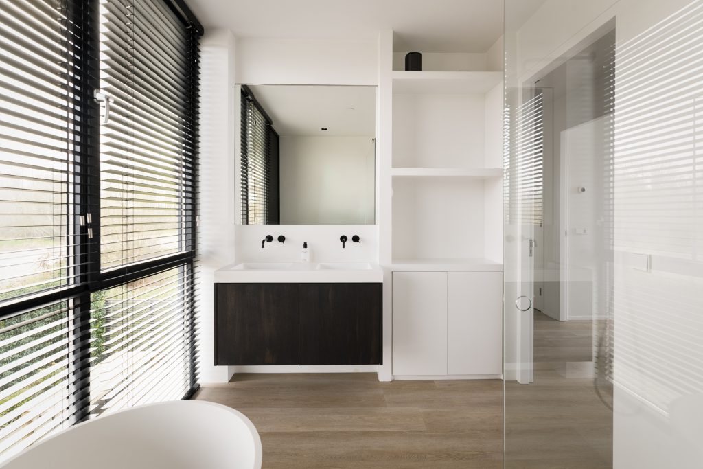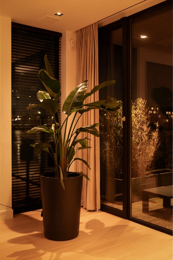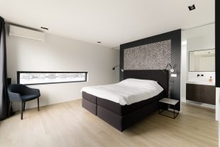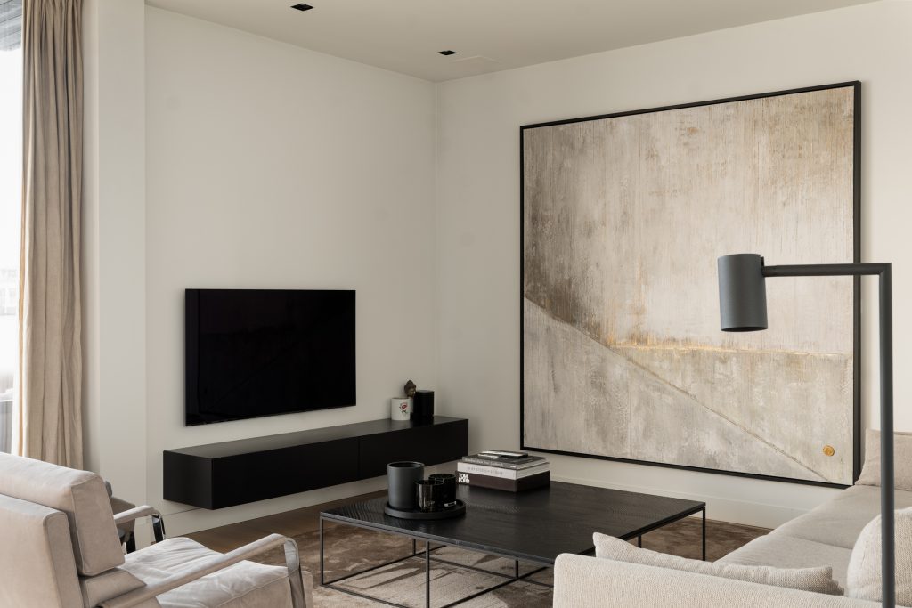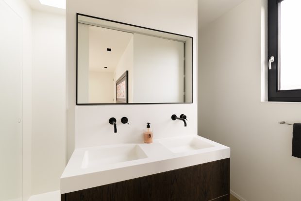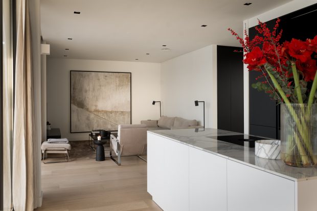 Through the beautifully landscaped front garden, you reach the entrance of the home. The ground floor is an impressive open-plan living space where the living room, dining area, and kitchen flow seamlessly together. The atrium and large windows create exceptional natural light and a sense of spaciousness. The luxurious kitchen is equipped with premium built-in appliances and forms the heart of the home, with direct access to the waterside terrace.
