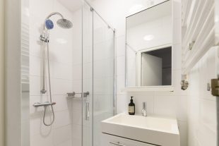 The master bedroom and bathroom are located in the hall. The bedroom of approx. 13m2 is light and spacious with the large windows providing a nice connection to the outside and where the authentic fireplace has also been preserved for a nice reference to the original construction period. The fully tiled bathroom is finished in the timeless color white and equipped with a shower, towel radiator and a sink with storage unit. Throughout the apartment, with the exception of the wet rooms, there is the same, attractive floor. This creates unity and peace.