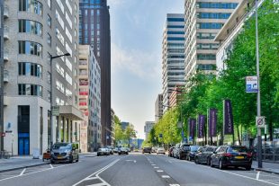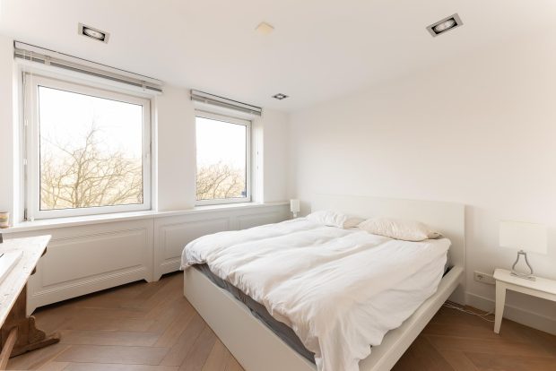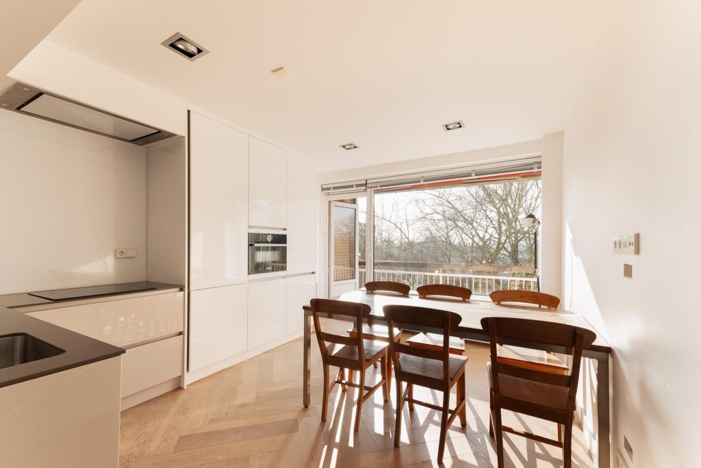 Upon entering the fifth floor follows the spacious hallway with space for a wardrobe, the meter cupboard, practical fixed custom cabinets and a steel door with glass to the very bright living room with open kitchen. There is also access to the two bedrooms, the bathroom and a separate toilet. The spacious, open living room is fantastic light due to the many windows and good layout where the exclusive recessed lighting and wooden herringbone floor are beautiful details. The first balcony, which is wide and covered, is adjacent to the kitchen and has space for a lovely seating arrangement and is facing south. There is an attractive view of the surrounding greenery and architecture in the area. The fresh, bright kitchen is equipped with various appliances including a dishwasher, oven, induction cooktop, an exhaust hood, refrigerator and a Quooker hot water faucet. A large dining table also gets a nice spot here by the light from the large window.