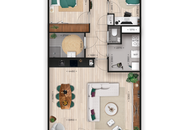 This modern apartment from 2024 features a bright and spacious living room with direct access to a full-width balcony, perfect for a morning coffee or an evening dinner. The open kitchen connects seamlessly to the living area, making cooking and dining a social experience. The apartment includes two comfortable bedrooms, a modern bathroom, separate toilet and indoor storage room. The layout is both practical and spacious with a total living area of 85 m².
