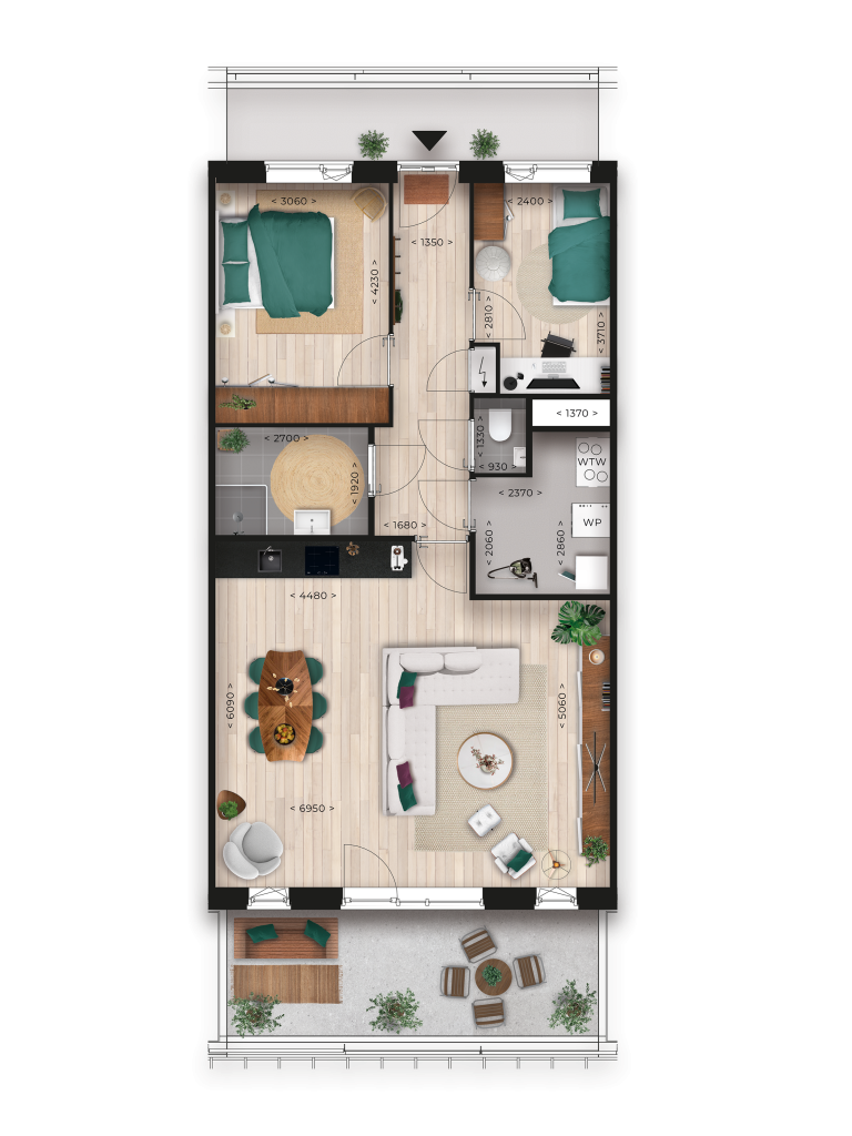 This modern apartment from 2024 features a bright and spacious living room with direct access to a full-width balcony, perfect for a morning coffee or an evening dinner. The open kitchen connects seamlessly to the living area, making cooking and dining a social experience. The apartment includes two comfortable bedrooms, a modern bathroom, separate toilet and indoor storage room. The layout is both practical and spacious with a total living area of 85 m².