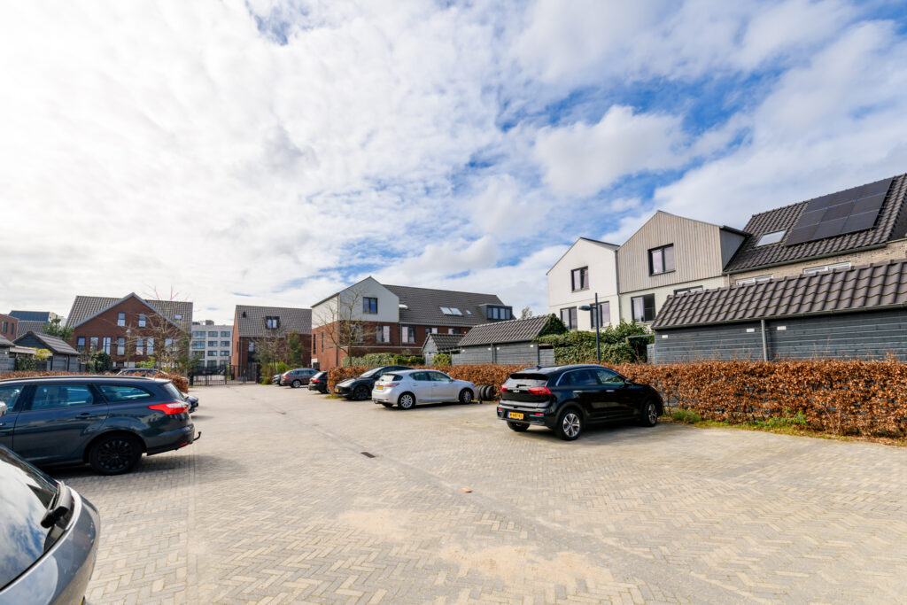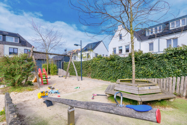 A parking courtyard with two private parking spaces has been created at the rear of the property. This courtyard is accessible only to residents whose homes border it. The courtyard is enclosed by several lockable gates for pedestrians and cyclists, as well as a vehicle entrance, and is operated by a remote control. There is also a fenced-in playground for the little ones. Because the parking courtyard is spacious, the backyard offers plenty of privacy due to the considerable distance from the rear neighbors.