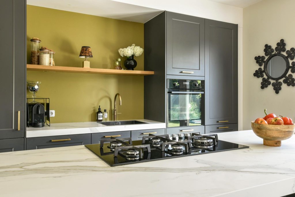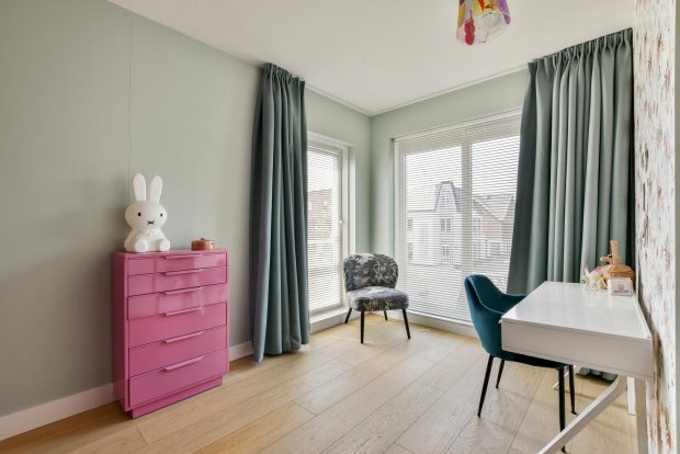 Upon entering through the front garden we find a very spacious hall with large wardrobe and access to the toilet. From the hall we enter through a beautiful designer door the living room which is luxuriously finished with beautiful stucco and a beautiful oak floor in herringbone and a beautiful built-in cupboard. Because of the many windows and doors on three sides of the house, the house gets a lot of light. The first floor features a playful layout located around the hall. This creates a living room at the front of the house a luxury kitchen with a at the rear and a cozy “TV room” at the front of the house.