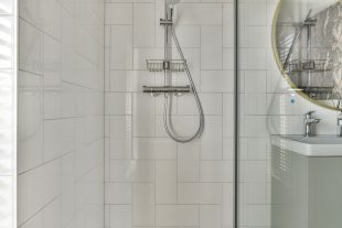 On the second floor there are three spacious bedrooms. The bathroom is located at the rear and finished with light, luxury plumbing and tiling. The bathroom has a washbasin cabinet, walk-in shower, bathtub and toilet. Again, the level of finish is high; sleek stucco on walls and ceilings in muted colors.