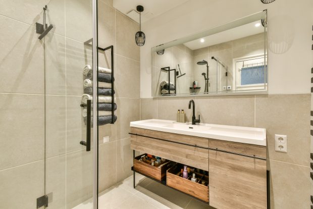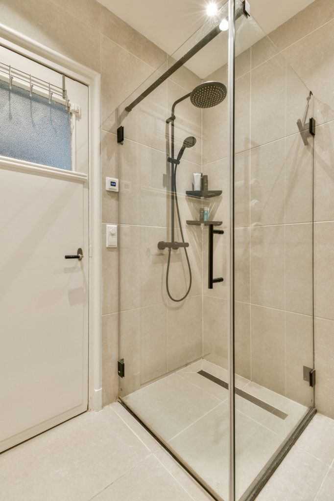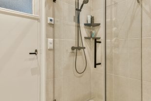 De badkamer is centraal gelegen en is voorzien van een inloopdouche, een wastafel en een inbouwkast.