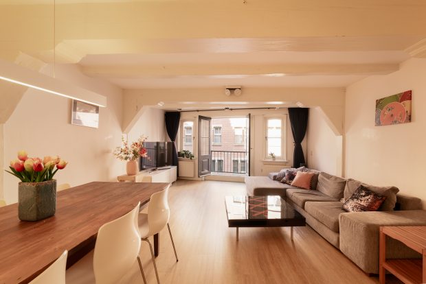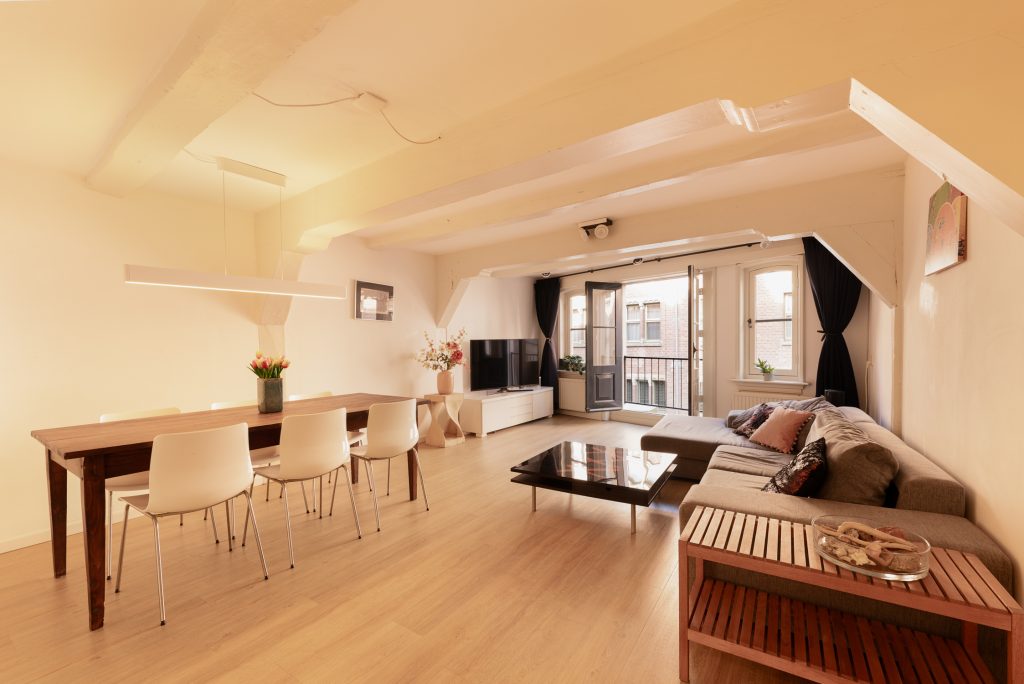 Aan de voorzijde van de woning is de ruime en lichte woonkamer met een heerlijke living met een Frans balkon. Vanuit hier heb je een prachtige uitzicht op de Beurs van Berlage. Er is ook genoeg ruimte voor een eethoek.