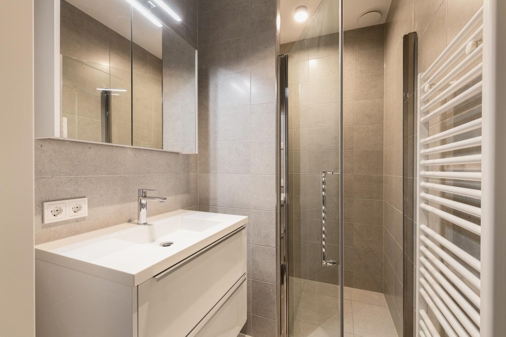 Gang met ruime berging voor opslag/techniek met aansluiting voor wasmachine/droger, apart toilet en moderne badkamer wastafel en inloopdouche. Aan de oostzijde twee slaapkamers met inbouwkasten. Alle appartementen van dit type zijn voorzien van een extra breed PVC vloer, wandafwerking, inbouwkasten, gordijnen en verlichting.