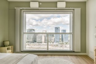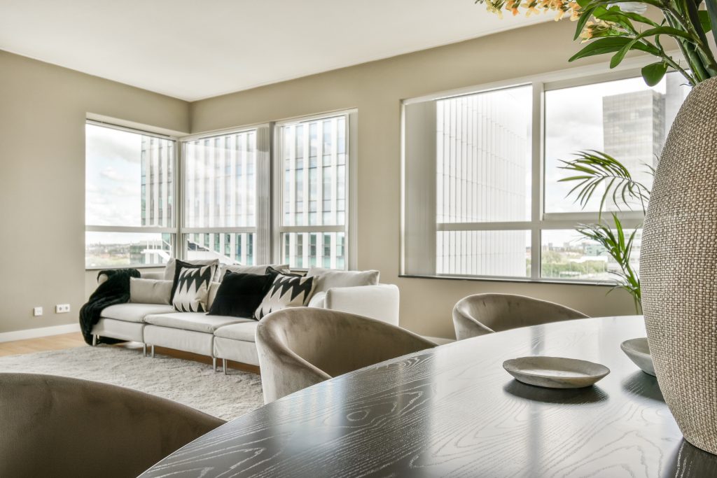 Het appartement is bereikbaar via een luxe en ruime lift. De entree van het appartement leidt naar een royale hal die toegang biedt tot de woonkamer aan de oost zijde, een apart toilet, de ruime badkamer en de twee slaapkamers. De woonkamer biedt volledige vrijheid voor interieurdesign met vijf grote ramen die de kamer de hele dag door vullen met natuurlijk licht. Omdat de ramen verticaal lopen, voelt de ruimte extra hoog en luchtig, wat de stedelijke energie van de Zuidas perfect weerspiegelt. De lichte houten vloeren dragen bij aan een frisse en ruimtelijke sfeer. Centraal in de woonkamer staat de luxe keuken, uitgerust met natuurstenen werkbladen, een kookplaat, een inbouwoven en ruime opbergmogelijkheden. Een uniek kenmerk is de serre met openslaande ramen, die een binnen-buiten ervaring creëert—ideaal om te ontspannen met een panoramisch uitzicht op de skyline van de Zuidas.