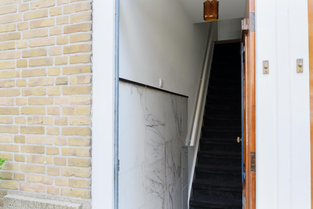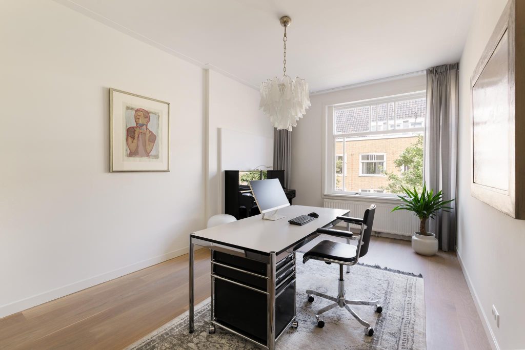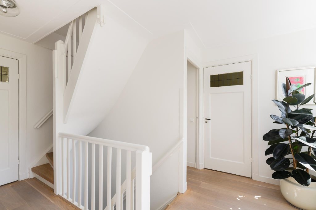 De privé entree op de begane grond wordt gevolgd door de eigen trapopgang naar de eerste etage. Hier ligt een L-vormige hal waaraan alle vertrekken op deze verdieping grenzen, te beginnen met de riante living over de gehele lengte van het bovenhuis. De lichte ruimte is prachtig afgewerkt met een eikenhouten vloer, plafond sierlijsten en openslaande deuren naar het zonnige balkon aan de achterzijde. Hier is volop ruimte voor een heerlijke loungeset met zicht op de groene binnentuinen. De moderne keuken is toegankelijk via de sfeervolle oude deur met glas-in-lood. De keuken is voorzien van alle gemakken, waaronder een 5-pitsgaskookplaat, afzuigkap, een vaatwasser, combimagnetron, oven en koel-vriescombinatie. Aan de voorzijde liggen twee slaapkamers waarvan één zeer ruim met een oppervlakte van 17m2 die door de huidige bewoners in gebruik is als werk- en muziekkamer. Ook aan de achterzijde ligt een ruime, sfeervolle slaapkamer met een grote raampartij waardoor de kamer aangenaam licht is. Aan de overloop ligt een toilet met fonteintje.