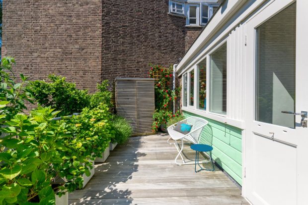 Vanaf de royale overloop op de tweede etage zijn nog eens drie slaapkamers bereikbaar waarvan de masterbedroom beschikt over een riante garderobekast. Ook deze etage is voorzien van dezelfde kwalitatief hoogwaardige houten vloer wat zorgt voor eenheid en rust. Bovendien zijn de trappen bekleed met eenzelfde houtsoort. De badkamer is voorzien van een ligbad, inloopdouche, toilet, wastafel met modern opbergmeubel, inbouwverlichting en een handdoekradiator. De combinatie van kleuren en materialen maakt het een tijdloze ruimte. Vanaf de overloop is het riante dakterras bereikbaar. Met de gunstige ligging op het Zuiden ten opzichte van de zon is het hier al vroeg in het jaar heerlijk vertoeven. Door de goed geplaatste bakken met beplanting is er veel privacy.