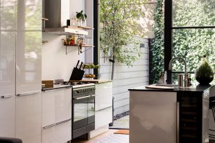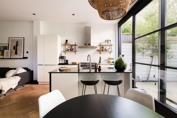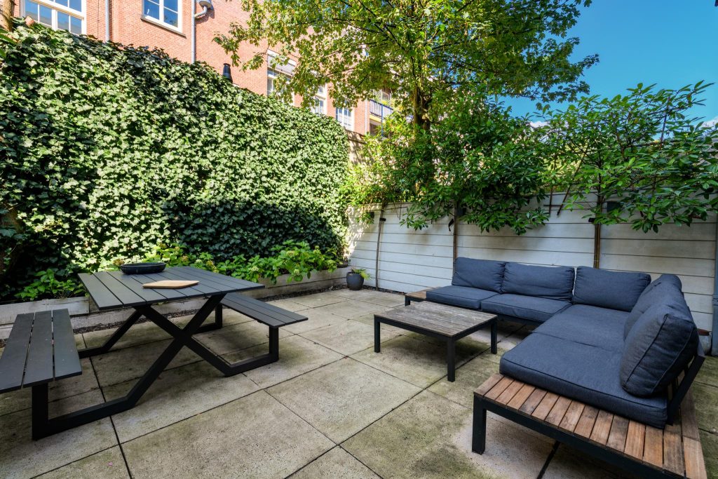 Dat dit appartement tot in detail is uitgedacht, is meteen bij binnenkomst te zien in de lange hal waar een visgraat vloer, hoge plinten en zwart houtwerk de sfeer bepalen. Aan het einde van de hal, waar alle vertrekken aan grenzen, ligt de open living die te betreden is door de plafondhoge, dubbele deuren. Via de ruime zithoek is de open keuken toegankelijk die een mooie verbinding heeft met de grote tuin (31m2) door de schuifpui. De neutrale keuken is geplaatst in een rechte opstelling met een eiland waardoor er veel werk- en kastruimte is ontstaan. Uiteraard is alle denkbare apparatuur aanwezig, zoals een vaatwasser, koelvriescombinatie, een breed fornuis met 6-kookpitten en twee ovens, een afzuigkap en een Quooker heetwaterkraan. Er is zelfs een ingebouwde wijnklimaatkast aanwezig en een patio die bereikbaar is vanuit één van de slaapkamers. De tuin is een aangename plek om optimaal te genieten van het stadse buitenleven. Er is meer dan genoeg ruimte voor zowel een loungeset als een grote eettafel.