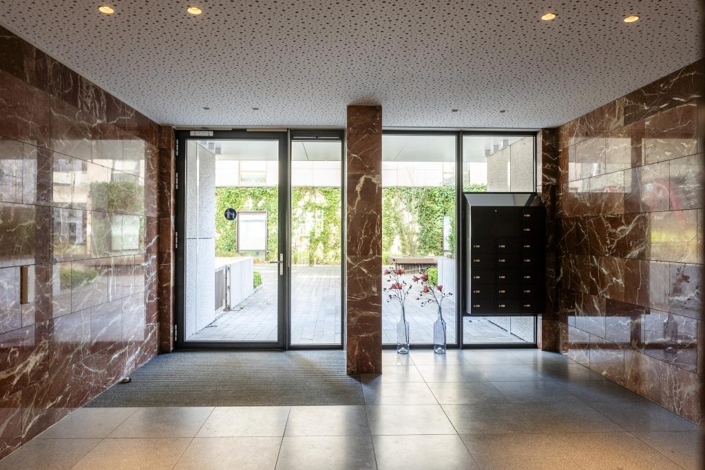 Via de Fred Roeskestraat via de imposante centrale hoofdentree met dubbele hoogte en wit natuursteen door de binnentuin naar het eigen gebouw.
