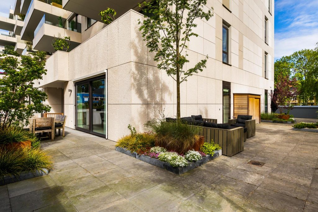 De groene en goed onderhouden binnentuin is voorzien van een fraaie langwerpige spiegelvijver, vlindertuin en zitelementen. Om deze binnentuin liggen de drie woonblokken gegroepeerd. De binnentuin, de glazen balkons, de fraaie lichte natuurstenen gevels en koperkleurige kozijnen en grote raampartijen, geven het geheel een mediterrane uitstraling en sfeer.