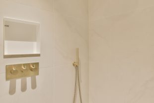 Deze badkamer is voorzien van riante regendouche, wastafelmeubel met mooie spiegel en designradiator.