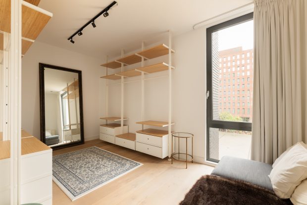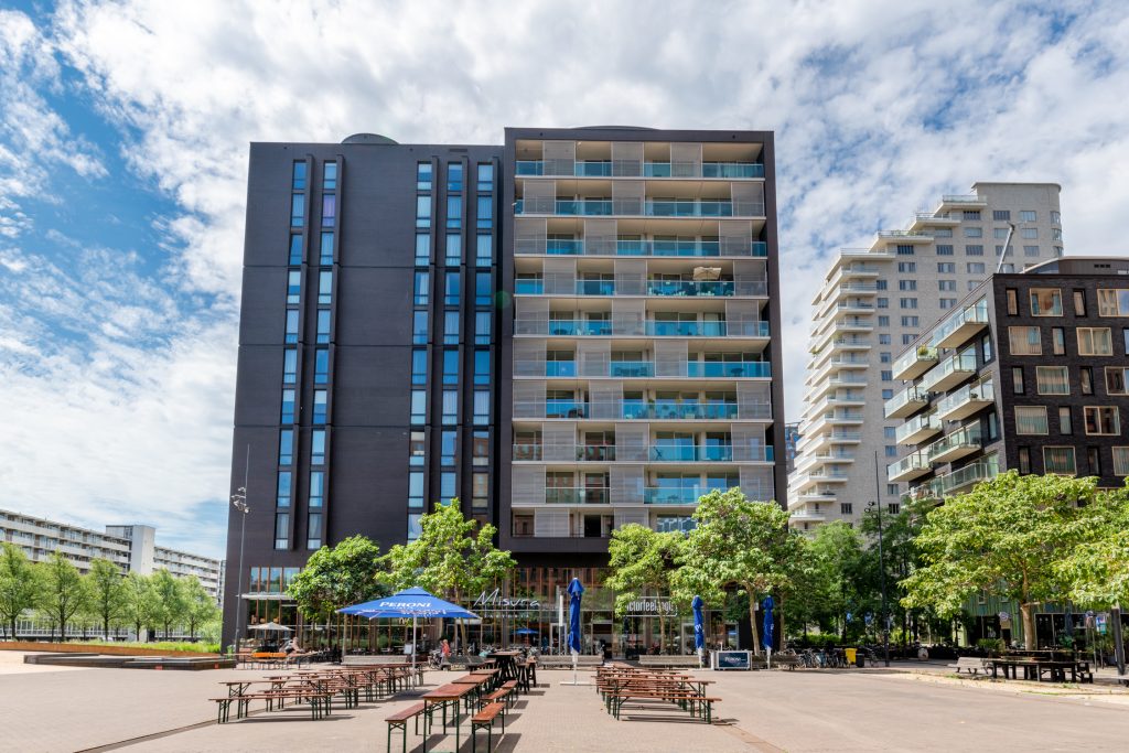 Vanuit de gemeenschappelijke hoofdentree aan de George Gershwinlaan en de riante binnenplaats brengt de lift u naar de derde etage, waar de entree tot het appartement zich bevindt. De toegang tot de Miles Building is uitstekend beveiligd dankzij een video-intercomsysteem en cameratoezicht, wat bijdraagt aan het gevoel van veiligheid en privacy dat dit gebouw biedt. Tevens is er een huismeester aanwezig van 9:00 – 17:00 uur iedere maandag tot en met donderdag voor extra veiligheid;
