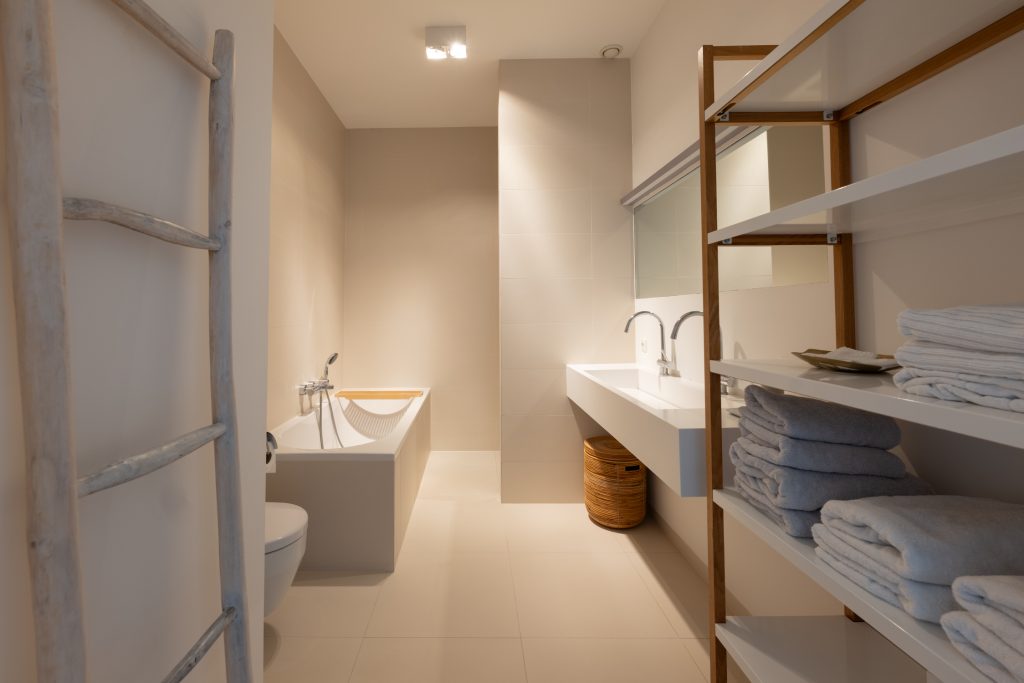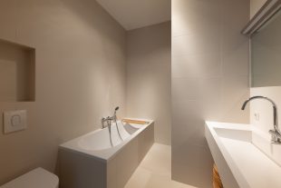 – Badkamer met inloopdouche, separaat bad, dubbele wastafel en toilet;