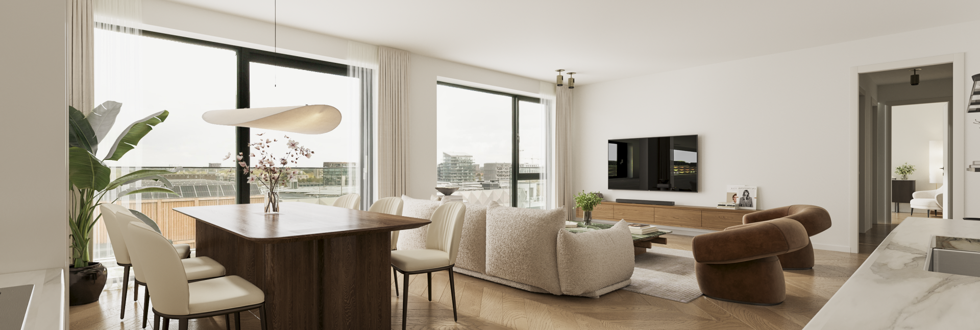 De appartementen zijn slim ingedeeld, waarbij grote raampartijen voor veel natuurlijk licht zorgen.