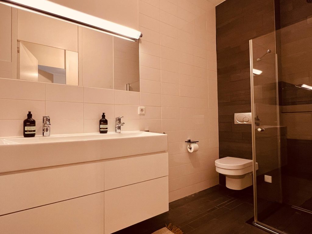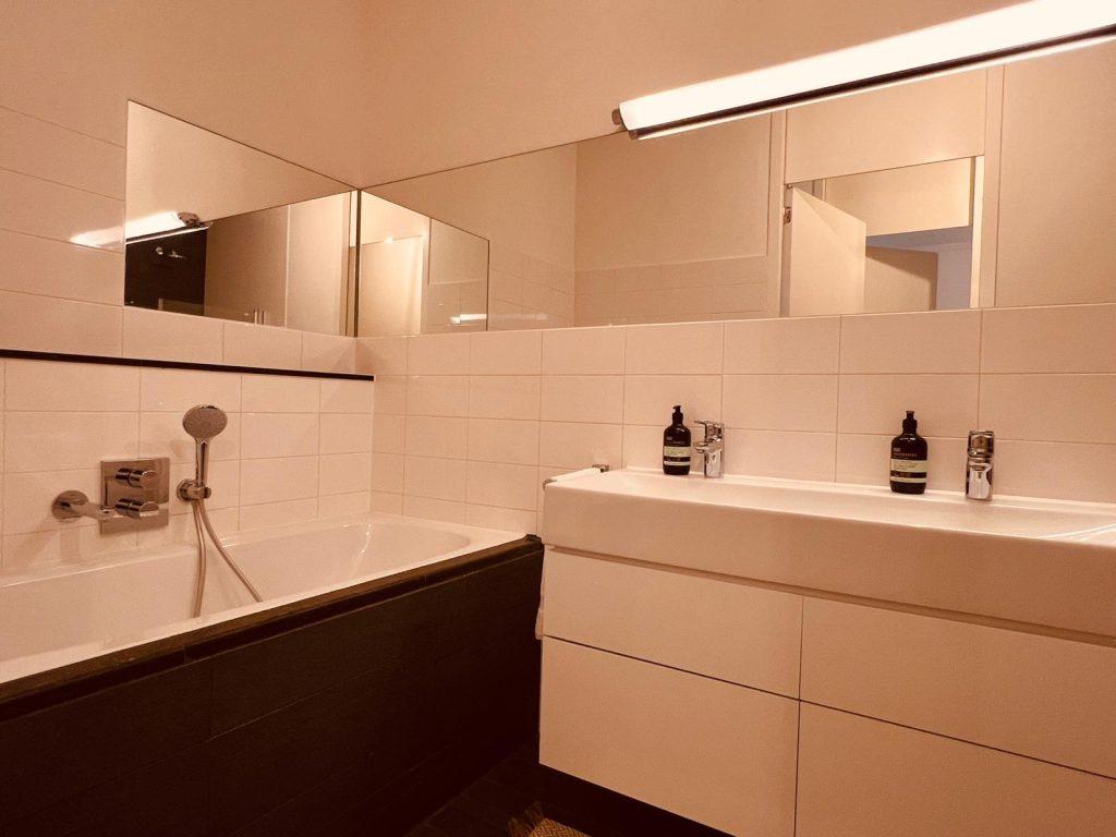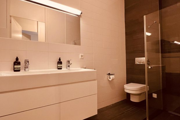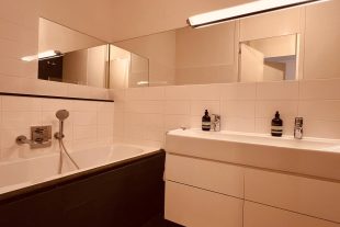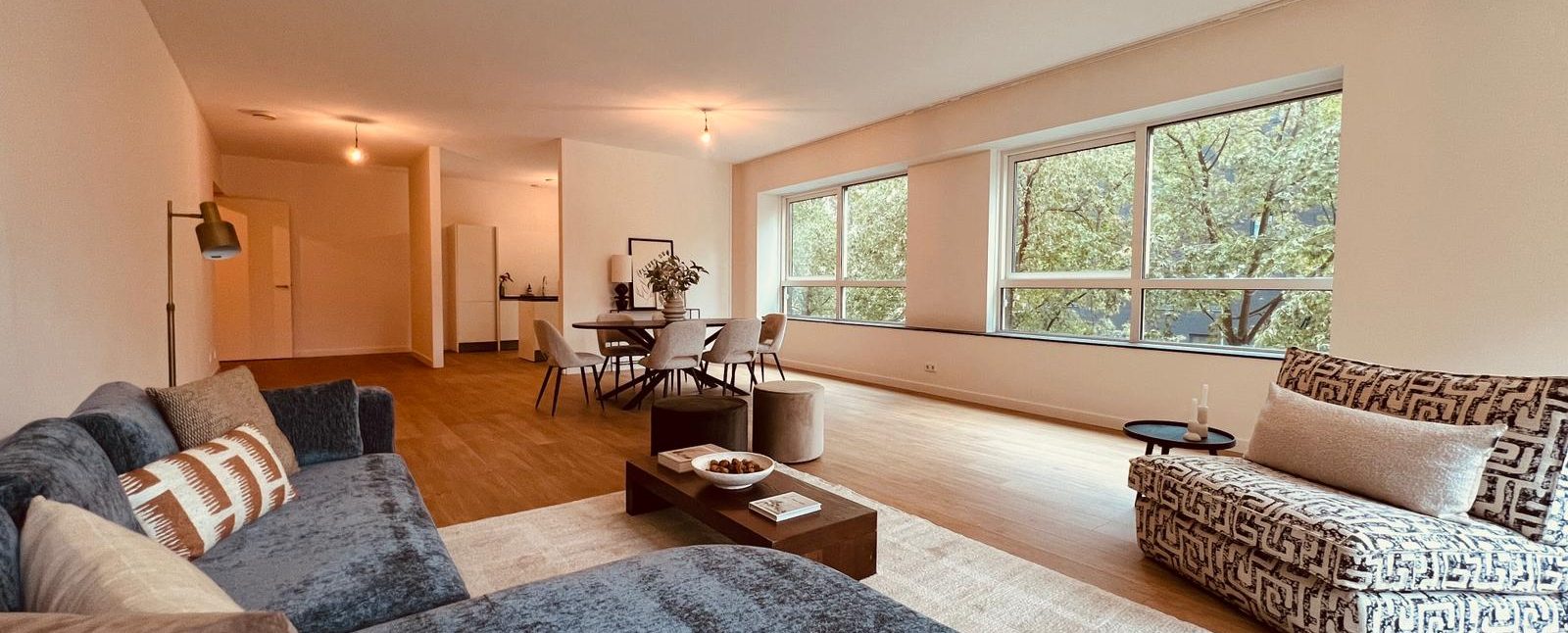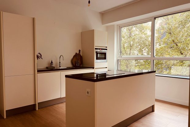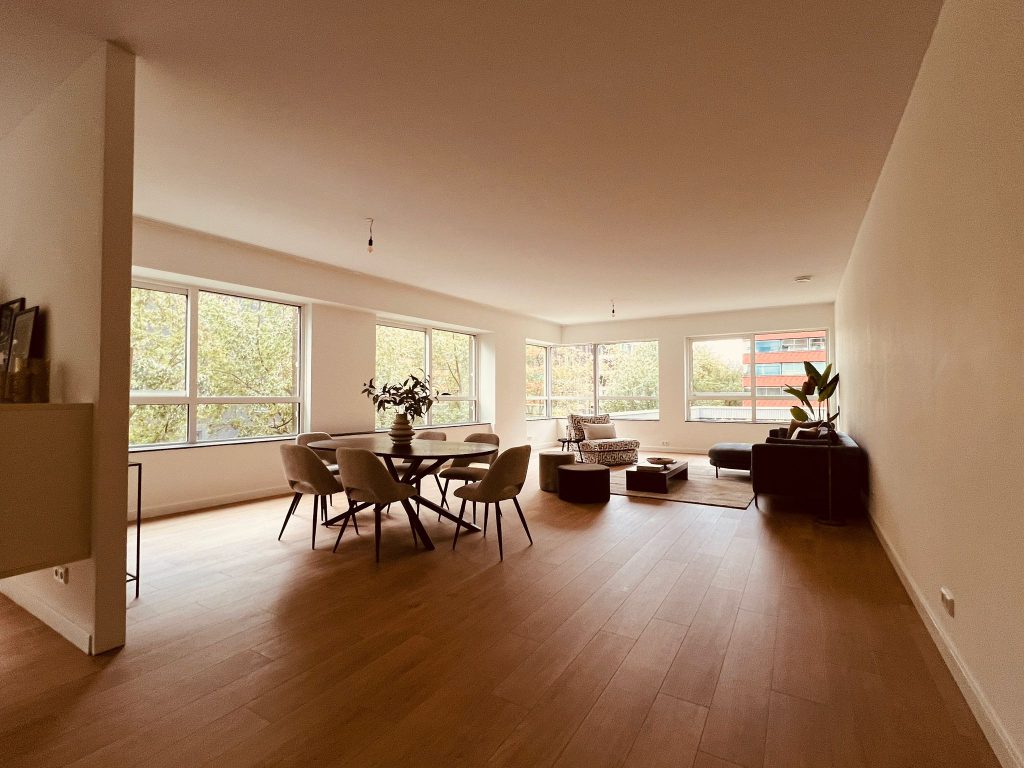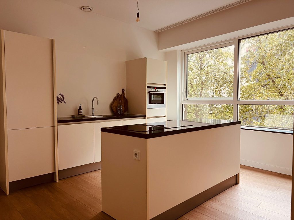 Met de lift bereikt u het appartement op de eerste verdieping. De ruime hal geeft toegang tot alle vertrekken. De royale woonkamer is bijzonder licht dankzij de grote raampartijen en biedt volop ruimte voor een comfortabele zithoek en een grote eettafel. De moderne, open keuken is voorzien van luxe inbouwapparatuur, natuurstenen werkblad en veel opbergruimte.