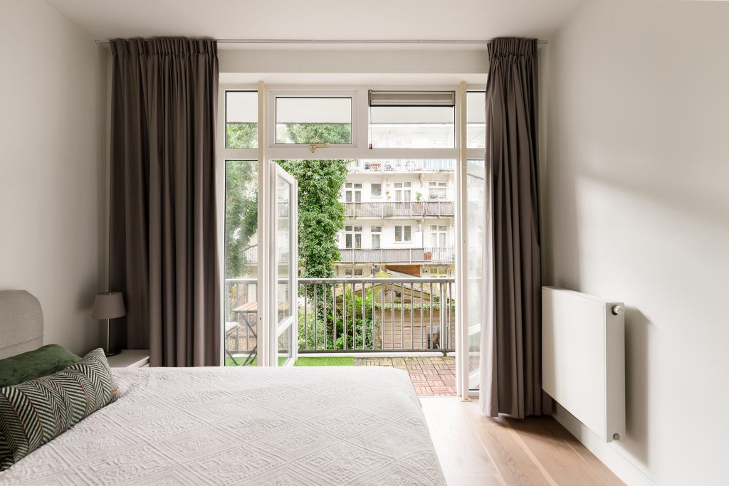 Aan de achterzijde van de woning bevinden zich twee ruime slaapkamers, beide voorzien van openslaande deuren naar het royale balkon.