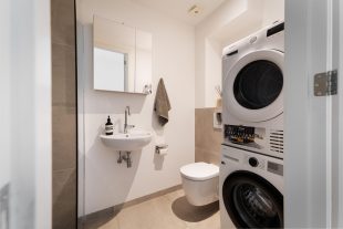De moderne badkamer beschikt over een inloopdouche, wastafelmeubel, toilet en een aansluiting voor de wasmachine/droger.