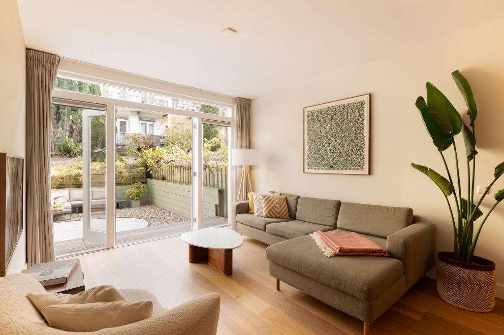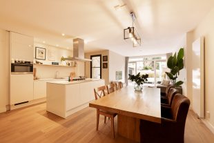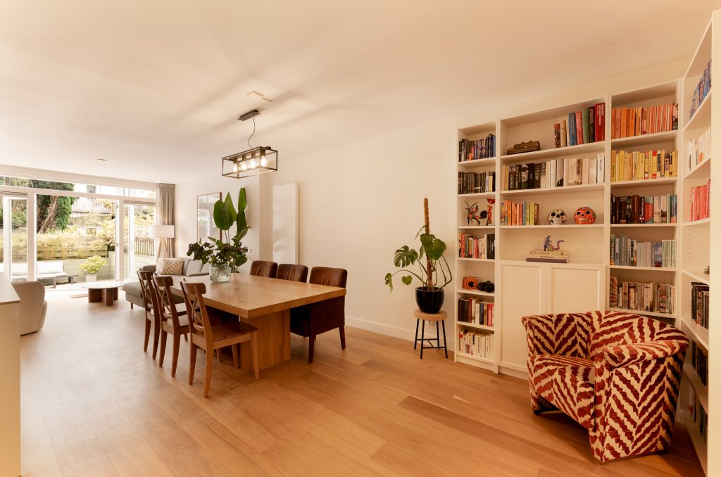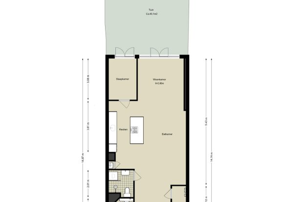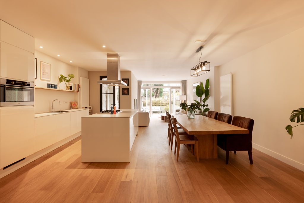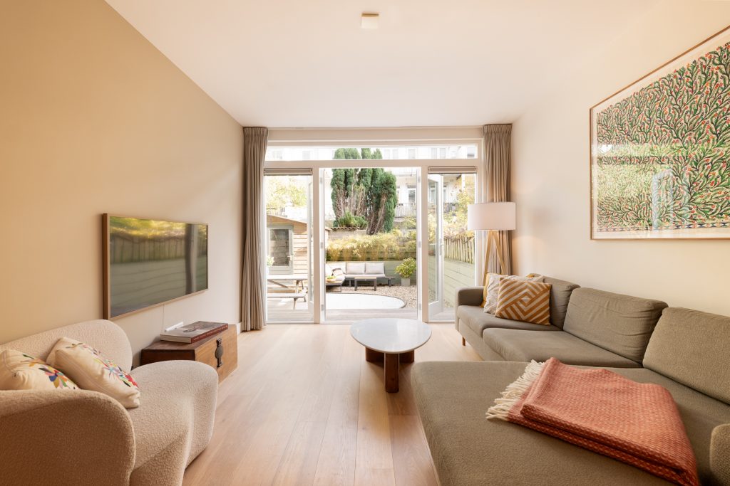 Via de voortuin met ruimte voor fietsen en een zitje in de middagzon, is er toegang tot de woning via een eigen entree. De hal leidt naar de lichte en brede woonkamer, waar de uitbouw zorgt voor extra leefruimte en een prettige verbinding met de tuin. Openslaande deuren geven toegang tot de zonnige achtertuin van ca. 40 m² op het zuidoosten, met een royale berging van ca. 8 m².
