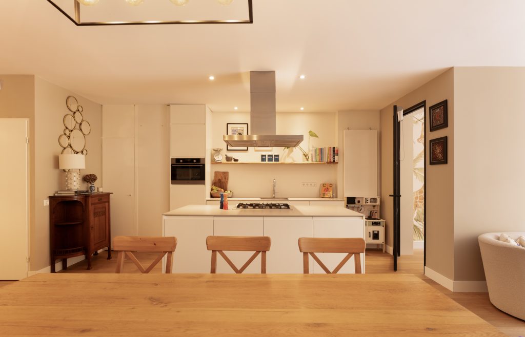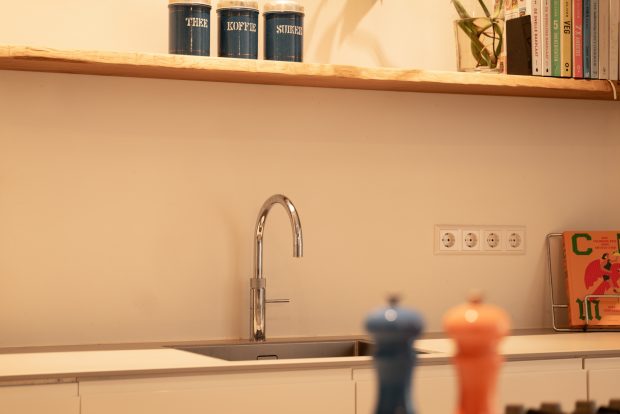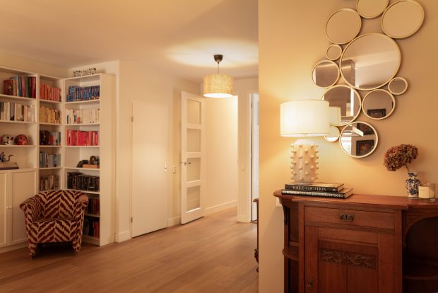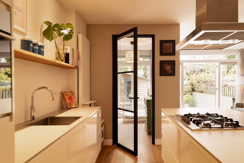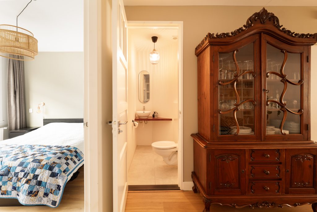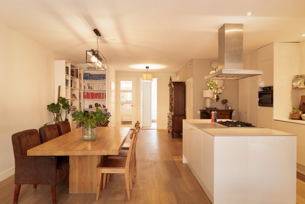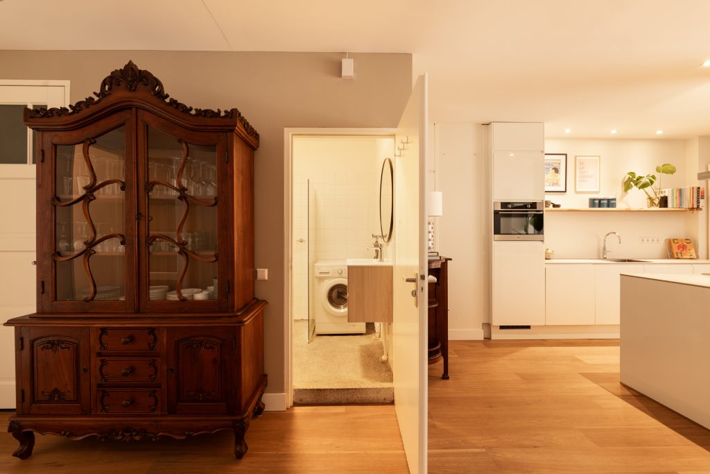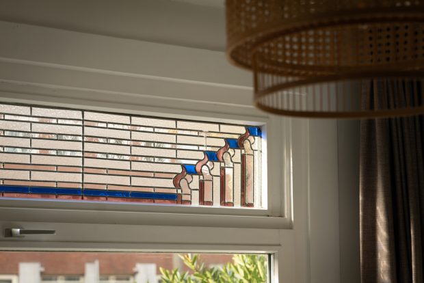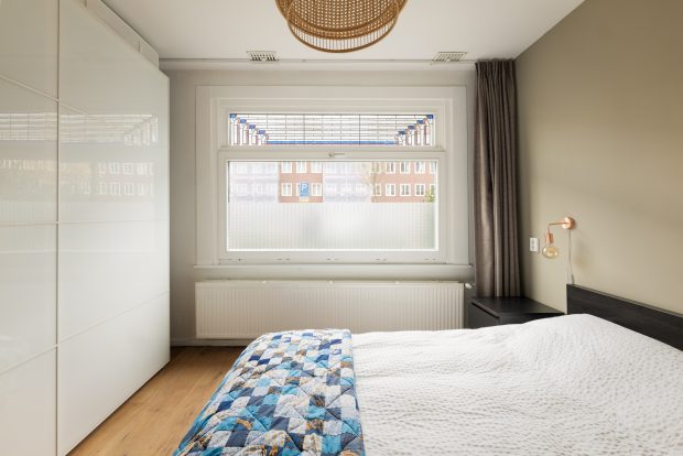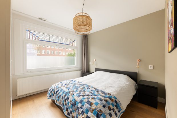 De open keuken is stijlvol en praktisch ingericht, voorzien van diverse inbouwapparatuur en een Quooker. De indeling is logisch en ruimtelijk, met aan de voorzijde een royale slaapkamer met karakteristieke glas-in-loodramen. Aan de achterzijde bevindt zich een tweede kamer, ideaal als kinderkamer, werkplek of logeerkamer.